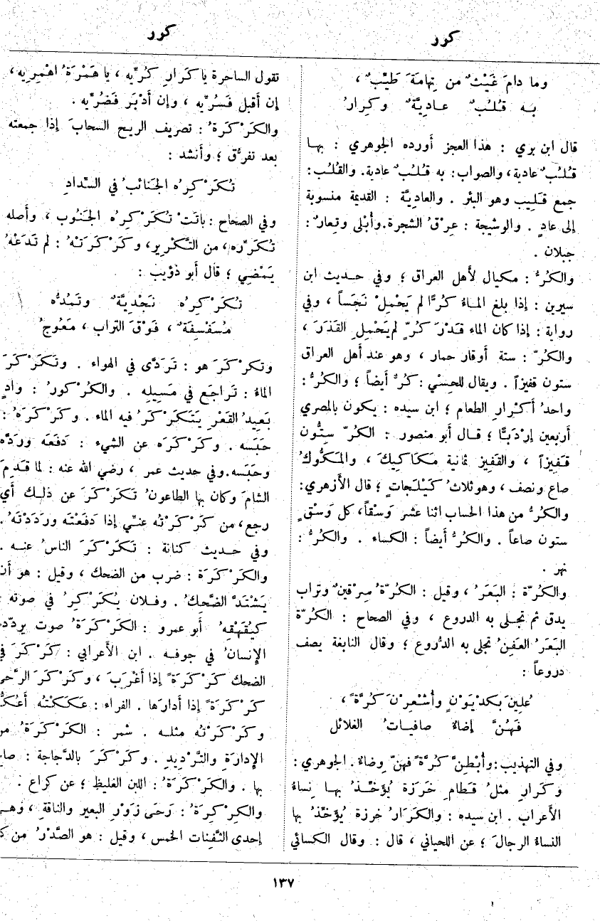 ، والكُرّ: سِتَّةُ أَوقار حِمَارٍ، وَهُوَ عِنْدَ أَهل الْعِرَاقِ سِتُّونَ قَفِيزًا. وَيُقَالُ للحِسْي: كُرٌّ أَيضاً؛ والكُرُّ: واحدٌ أَكْرارِ الطَّعَامِ؛ ابْنُ سِيدَهْ: يَكُونُ بِالْمِصْرِيِّ أَربعين إِرْدَبًّا؛ قَالَ أَبو مَنْصُورٍ: الكُرّ سِتُّون قَفِيزاً، والقَفِيز ثَمَانِيَةُ مَكَاكِيكَ، والمَكُّوكُ صَاعٌ وَنِصْفٌ، وَهُوَ ثلاثُ كَيْلَجاتٍ؛ قَالَ الأَزهري: والكُرُّ مِنْ هَذَا الْحِسَابِ اثْنَا عَشَرَ وَسْقاً، كُلُّ وَسْقٍ سِتُّونَ صَاعًا. والكُرُّ أَيضاً: الْكِسَاءُ. والكُرُّ: نَهْرٌ. والكُرّة: البَعَرُ، وَقِيلَ: الكُرّةُ سِرْقينٌ وَتُرَابٌ يُدَقُّ ثُمَّ تُجْلَى بِهِ الدُّرُوعُ، وَفِي الصِّحَاحِ: الكُرّة البَعَرُ العَفِنُ تُجْلَى بِهِ الدُّروع؛ وَقَالَ النَّابِغَةُ يَصِفُ دُرُوعًا: