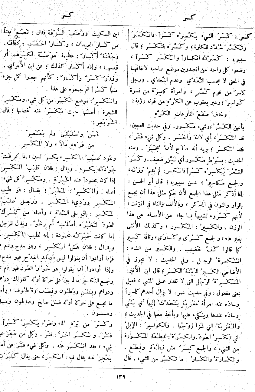 كسر: كَسَرَ الشَّيْءَ يَكْسِرُه كَسْراً فانْكَسَرَ وتَكَسَّرَ شُدِّد لِلْكَثْرَةِ، وكَسَّرَه فتَكَسَّر؛ قَالَ سِيبَوَيْهِ: كَسَرْتُه انْكِسَارًا وانْكَسَر كَسْراً، وَضَعُوا كُلَّ وَاحِدٍ مِنَ الْمَصْدَرَيْنِ مَوْضِعَ صَاحِبِهِ لِاتِّفَاقِهِمَا فِي الْمَعْنَى لَا بِحَسَبِ التَّعَدِّي وَعَدَمِ التَّعدِّي. وَرَجُلٌ كاسرٌ مِنْ قَوْمٍ كُسَّرٍ، وامرأَة كاسِرَة مِنْ نِسْوَةٍ كَواسِرَ؛ وَعَبَّرَ يَعْقُوبُ عن الكُرَّهِ من قول رؤبة: