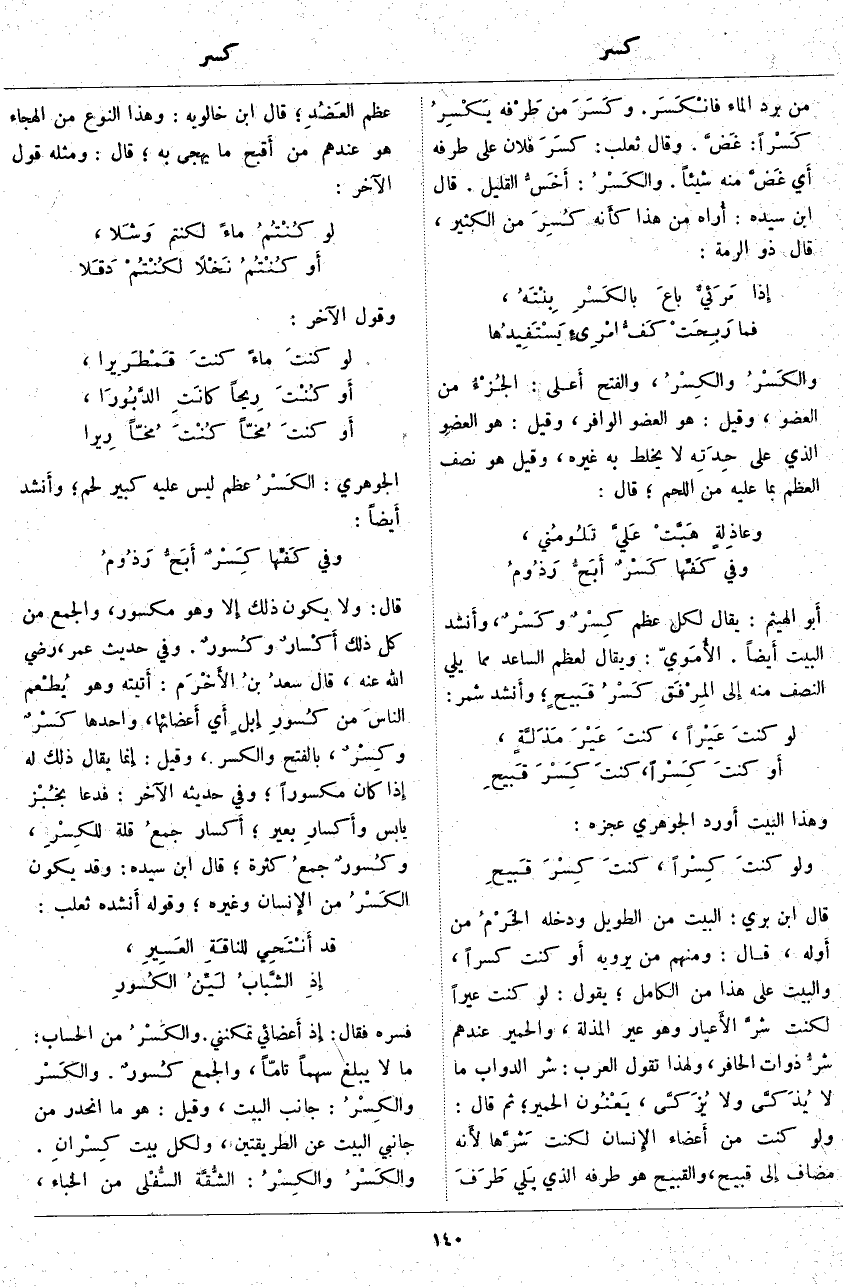 أَبو الْهَيْثَمِ: يُقَالُ لِكُلِّ عَظْمٍ كِسْرٌ وكَسْرٌ، وأَنشد الْبَيْتَ أَيضاً. الأُمَويّ: وَيُقَالُ لِعَظْمِ السَّاعِدِ مِمَّا يَلِي النِّصْفَ مِنْهُ إِلى المِرْفَق كَسْرُ قَبيحٍ؛ وأَنشد شِمْرٍ: