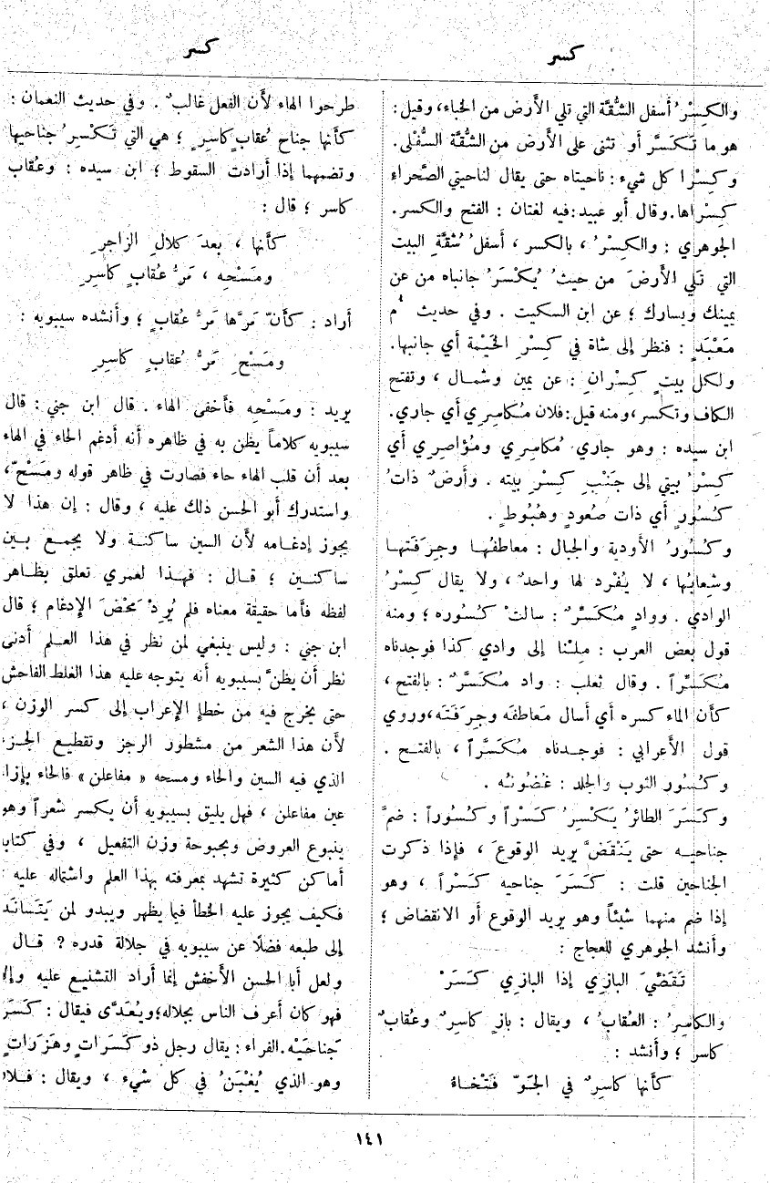 يُرِيدُ: ومَسْحِه فأَخفى الْهَاءَ. قَالَ ابْنُ جِنِّي: قَالَ سِيبَوَيْهِ كَلَامًا يُظَنُّ بِهِ فِي ظَاهِرِهِ أَنه أَدغم الْحَاءَ فِي الْهَاءِ بَعْدَ أَن قَلَبَ الْهَاءَ حَاءً فَصَارَتْ فِي ظَاهِرِ قَوْلِهِ ومَسْحّ، وَاسْتَدْرَكَ أَبو الْحَسَنِ ذَلِكَ عَلَيْهِ، وَقَالَ: إِن هَذَا لَا يَجُوزُ إِدغامه لأَن السِّينَ سَاكِنَةً وَلَا يُجْمَعُ بَيْنَ سَاكِنَيْنِ؛ قَالَ: فَهَذَا لَعَمْرِي تَعَلُّقٌ بِظَاهِرِ لَفْظِهِ فأَما حَقِيقَةُ مَعْنَاهُ فَلَمْ يُرِدْ مَحْضَ الإِدغام؛ قَالَ ابْنُ جِنِّي: وَلَيْسَ يَنْبَغِي لِمَنْ نَظَرَ فِي هَذَا الْعِلْمِ أَدنى نَظَرٍ أَن يظنَّ بِسِيبَوَيْهِ أَنه يَتَوَجَّهُ عَلَيْهِ هَذَا الْغَلَطُ الْفَاحِشُ حَتَّى يَخْرُجَ فِيهِ مِنْ خطإِ الإِعراب إِلى كَسْرِ الْوَزْنِ، لأَن هَذَا الشِّعْرَ مِنْ مَشْطُورِ الرَّجَزِ وَتَقْطِيعُ الْجُزْءِ الَّذِي فِيهِ السِّينُ وَالْحَاءُ وَمَسْحِهِ [مَفَاعِلُنْ] فَالْحَاءُ بإِزاء عَيْنِ مَفَاعِلُنْ، فَهَلْ يَلِيقُ بِسِيبَوَيْهِ أَن يَكْسِرَ شِعْرًا وَهُوَ يَنْبُوعُ الْعَرُوضِ وَبَحْبُوحَةُ وَزْنِ التَّفْعِيلِ، وَفِي كِتَابِهِ أَماكن كَثِيرَةٌ تَشْهَدُ بِمَعْرِفَتِهِ بِهَذَا الْعِلْمِ وَاشْتِمَالِهِ عَلَيْهِ، فَكَيْفَ يَجُوزُ عَلَيْهِ الْخَطَأُ فِيمَا يَظْهَرُ وَيَبْدُو لِمَنْ يَتَسانَدُ إِلى طَبْعِهِ فَضْلًا عَنْ سِيبَوَيْهِ فِي جَلَالَةِ قَدْرِهِ؟ قَالَ: وَلَعَلَّ أَبا الْحَسَنِ الأَخفش إِنما أَراد التَّشْنِيعَ عَلَيْهِ وإِلا فَهُوَ كَانَ أَعرف النَّاسِ بِجَلَالِهِ؛ ويُعَدَّى فَيُقَالُ: كَسَرَ جَناحَيْه. الْفَرَّاءُ: يُقَالُ رَجُلٌ ذُو كَسَراتٍ وهَزَراتٍ، وَهُوَ الَّذِي يُغْبَنُ فِي كُلِّ شَيْءٍ، وَيُقَالُ: فُلَانٌ