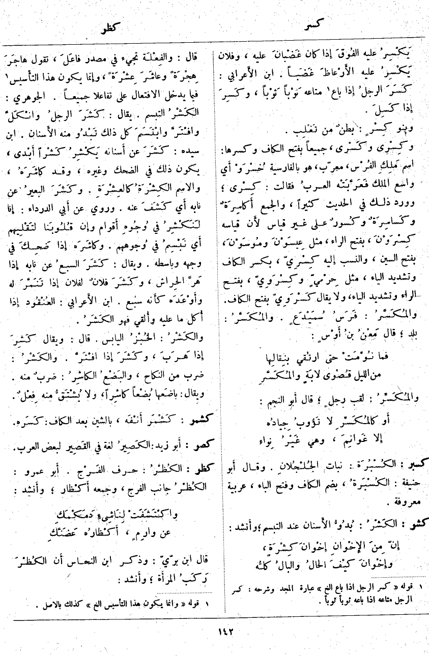 قَالَ: والفِعْلَة تَجِيءُ فِي مَصْدَرِ فاعَلَ، تَقُولُ هاجَرَ هِجْرَةً وعاشَرَ عِشْرَةً. وَإِنَّمَا يَكُونُ هَذَا التأْسيس «3» فِيمَا يَدْخُلُ الِافْتِعَالُ عَلَى تَفَاعَلَا جَمِيعًا. الْجَوْهَرِيُّ: الكَشْرُ التَّبَسُّمُ. يُقَالُ: كَشَرَ الرجلُ وانْكَلَّ وافْتَرَّ وابْتَسَمَ كُلُّ ذَلِكَ تَبْدَوُ مِنْهُ الأَسنان. ابْنُ سِيدَهْ: كَشَرَ عَنْ أَسنانه يَكْشِرُ كَشْراً أَبْدى، يَكُونُ ذَلِكَ فِي الضَّحِكِ وَغَيْرِهِ، وَقَدْ كاشَرَهُ، وَالِاسْمُ الكِشْرَةُ كالعِشْرَةِ. وكَشَرَ البعيرُ عَنْ نَابِهِ أَي كَشَفَ عَنْهُ. وَرُوِيَ عَنْ أَبي الدَّرْدَاءِ: إِنَّا لَنَكْشِرُ فِي وُجُوهِ أَقوام، وإِن قُلُوبَنا لتَقْلِيهم أَي نَبْسِمُ فِي وُجوههم. وكاشَرَه إِذَا ضَحِكَ فِي وَجْهِهِ وَبَاسَطَهُ. وَيُقَالُ: كَشَرَ السبعُ عَنْ نَابِهِ إِذَا هَرَّ الحِراش، وكَشَرَ فلانٌ لِفُلَانٍ إِذَا تَنَمَّرَ لَهُ وأَوْعَدَه كأَنه سَبْعٌ. ابْنُ الأَعرابي: العُنْقُود إِذَا أُكل مَا عَلَيْهِ وأُلقي فَهُوَ الكَشَرُ. والكَشْرُ: الخُبْزُ الْيَابِسُ. قَالَ: وَيُقَالُ كَشِرَ إِذا هَرَبَ، وكَشَرَ إِذَا افْتَرَّ. والكَشْرُ: ضَرْبٌ مِنَ النِّكَاحِ، والبَضْعُ الكاشِرُ: ضربٌ مِنْهُ. وَيُقَالُ: باضَعها بُضْعاً كاشِراً، وَلَا يُشْتَقُّ مِنْهُ فِعْلٌ.