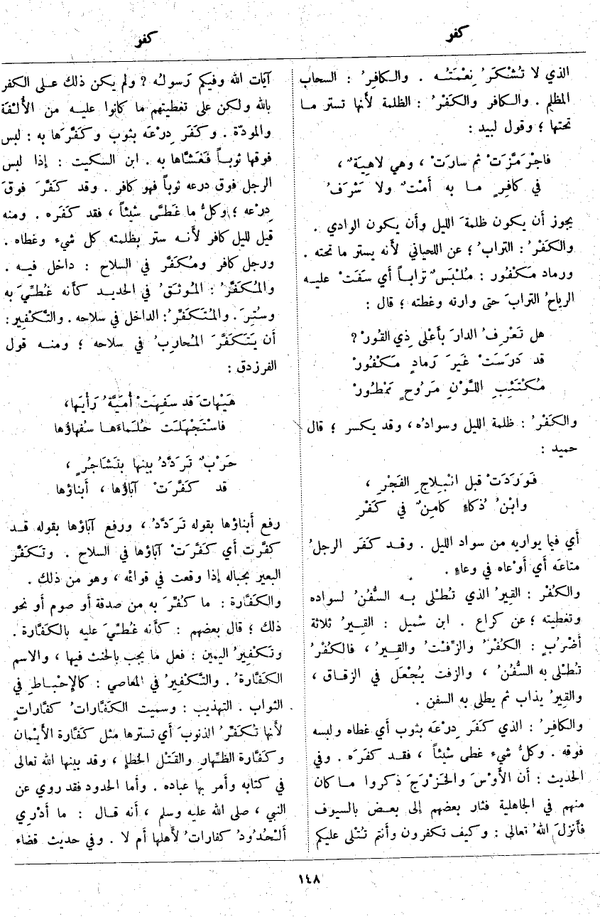 وَلَمْ يَكُنْ ذَلِكَ عَلَى الْكُفْرِ بِاللَّهِ وَلَكِنْ عَلَى تَغْطِيَتِهِمْ مَا كَانُوا عَلَيْهِ مِنَ الأُلْفَة وَالْمَوَدَّةِ. وكَفَر دِرْعَه بِثَوْبٍ وكَفَّرَها بِهِ: لَبِسَ فَوْقَهَا ثَوْبًا فَغَشَّاها بِهِ. ابْنُ السِّكِّيتِ: إِذا لَبِسَ الرَّجُلُ فَوْقَ دِرْعِهِ ثَوْبًا فَهُوَ كَافِرٌ. وَقَدْ كَفَّرَ فوقَ دِرْعه؛ وكلُّ مَا غَطَّى شَيْئًا، فَقَدَ كَفَره. وَمِنْهُ قِيلَ لِلَّيْلِ كَافِرٌ لأَنه سَتَرَ بِظُلْمَتِهِ كُلَّ شَيْءٍ وَغَطَّاهُ. وَرَجُلٌ كَافِرٌ ومُكَفَّر فِي السِّلَاحِ: دَاخِلٌ فِيهِ. والمُكَفَّرُ: المُوثَقُ فِي الْحَدِيدِ كأَنه غُطِّيَ بِهِ وسُتِرَ. والمُتَكَفِّرُ: الدَّاخِلُ فِي سِلَاحِهِ. والتَّكْفِير: أَن يَتَكَفَّرَ المُحارِبُ فِي سِلَاحِهِ؛ وَمِنْهُ قَوْلُ الْفَرَزْدَقِ: