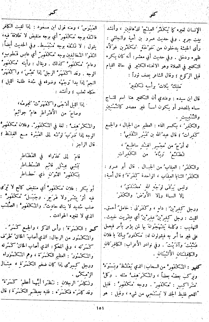 قَالَ ابْنُ سِيدَهْ: وَعِنْدِي أَن التَّكْفِيرَ هُنَا اسْمٌ لِلتَّاجِ سَمَّاهُ بِالْمَصْدَرِ أَو يَكُونُ اسْمًا غَيْرَ مَصْدَرٍ كالتَّمْتِينِ والتَّنْبِيتِ. والكَفِرُ، بِكَسْرِ الْفَاءِ: الْعَظِيمُ مِنَ الْجِبَالِ. وَالْجَمْعُ كَفِراتٌ؛ قَالَ عبدُ اللَّهِ بْنُ نُمَيْرٍ الثَّقَفِيُّ:
