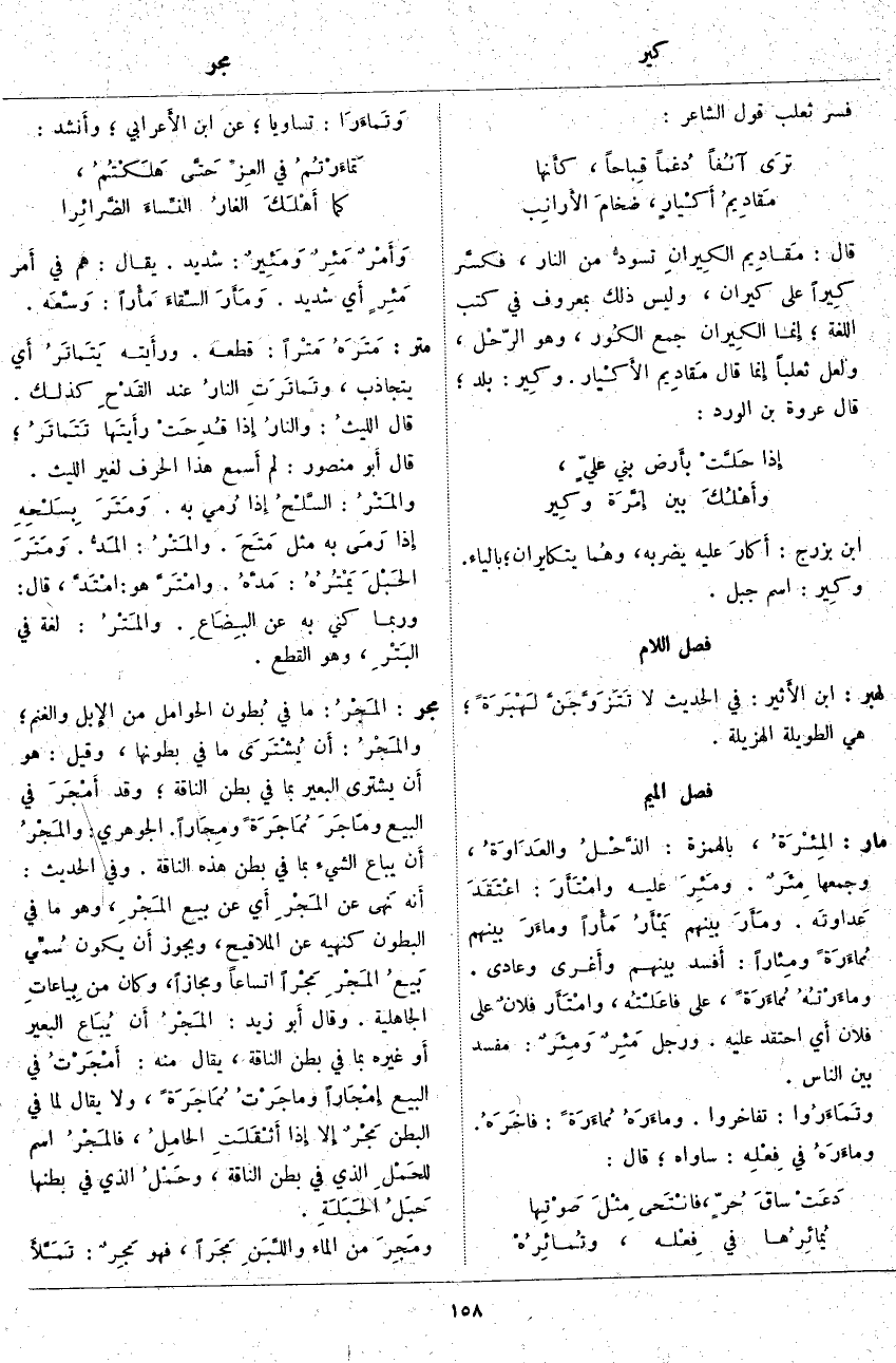 قَالَ: مَقادِيم الكِيرانِ تسودُّ مِنَ النَّارِ، فكسَّر كِيراً عَلَى كِيرَانِ، وَلَيْسَ ذَلِكَ بِمَعْرُوفٍ فِي كُتُبِ اللُّغَةِ؛ إِنما الكِيران جَمْعُ الكُور، وَهُوَ الرّحْل، وَلَعَلَّ ثَعْلَبًا إِنما قَالَ مَقادِيم الأَكْيار. وكِير: بَلَدٌ؛ قَالَ عُرْوَةُ بْنُ الْوَرْدِ: