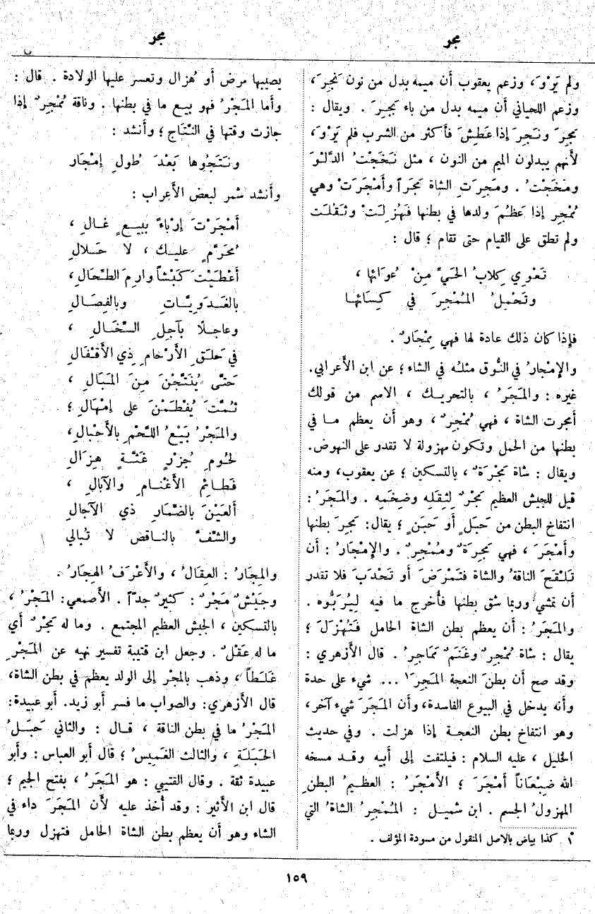 فإِذا كَانَ ذَلِكَ عَادَةً لَهَا فَهِيَ مِمْجَارٌ. والإِمْجارُ فِي النُّوق مثلُه فِي الشَّاءِ؛ عَنِ ابْنِ الأَعرابي. غَيْرُهُ: والمَجَرُ، بِالتَّحْرِيكِ، الِاسْمُ مِنْ قَوْلِكَ أَمجرت الشَّاةُ، فَهِيَ مُمْجِرٌ، وَهُوَ أَن يَعْظُمَ مَا فِي بَطْنِهَا مِنَ الْحَمْلِ وَتَكُونُ مَهْزُولَةً لَا تَقْدِرُ عَلَى النُّهُوضِ. وَيُقَالُ: شَاةٌ مَجْرَةٌ، بِالتَّسْكِينِ؛ عَنْ يَعْقُوبَ، وَمِنْهُ قِيلَ لِلْجَيْشِ الْعَظِيمِ مَجْرٌ لِثِقَلِه وضِخَمِه. والمَجَرُ: انْتِفَاخُ الْبَطْنِ مِنْ حَبَلٍ أَو حَبَنٍ؛ يُقَالُ: مَجِرَ بَطْنُهَا وأَمْجَرَ، فَهِيَ مَجِرَةٌ ومُمْجِرٌ. والإِمْجَارُ: أَن تَلْقَحَ الناقةُ وَالشَّاةُ فتَمْرَضَ أَو تَحْدَبَ فَلَا تَقْدِرُ أَن تَمْشِيَ وَرُبَّمَا شُقَّ بَطْنُهَا فأُخرج مَا فِيهِ لِيُرَبُّوه. والمَجَرُ: أَن يَعْظُمَ بطن الشاة الحامل فَتُهْزَلَ؛ يُقَالُ: شَاةٌ مُمْجِرٌ وغَنَمٌ مَمَاجِرُ. قَالَ الأَزهري: وَقَدْ صَحَّ أَن بطنَ النَّعْجَةِ المَجِرَ «5» ... شَيْءٌ عَلَى حِدَةٍ وأَنه يَدْخُلُ فِي الْبُيُوعِ الْفَاسِدَةِ، وأَن المَجَرَ شَيْءٌ آخَرُ، وَهُوَ انْتِفَاخُ بَطْنِ النَّعْجَةِ إِذا هُزِلَتْ. وَفِي حَدِيثِ