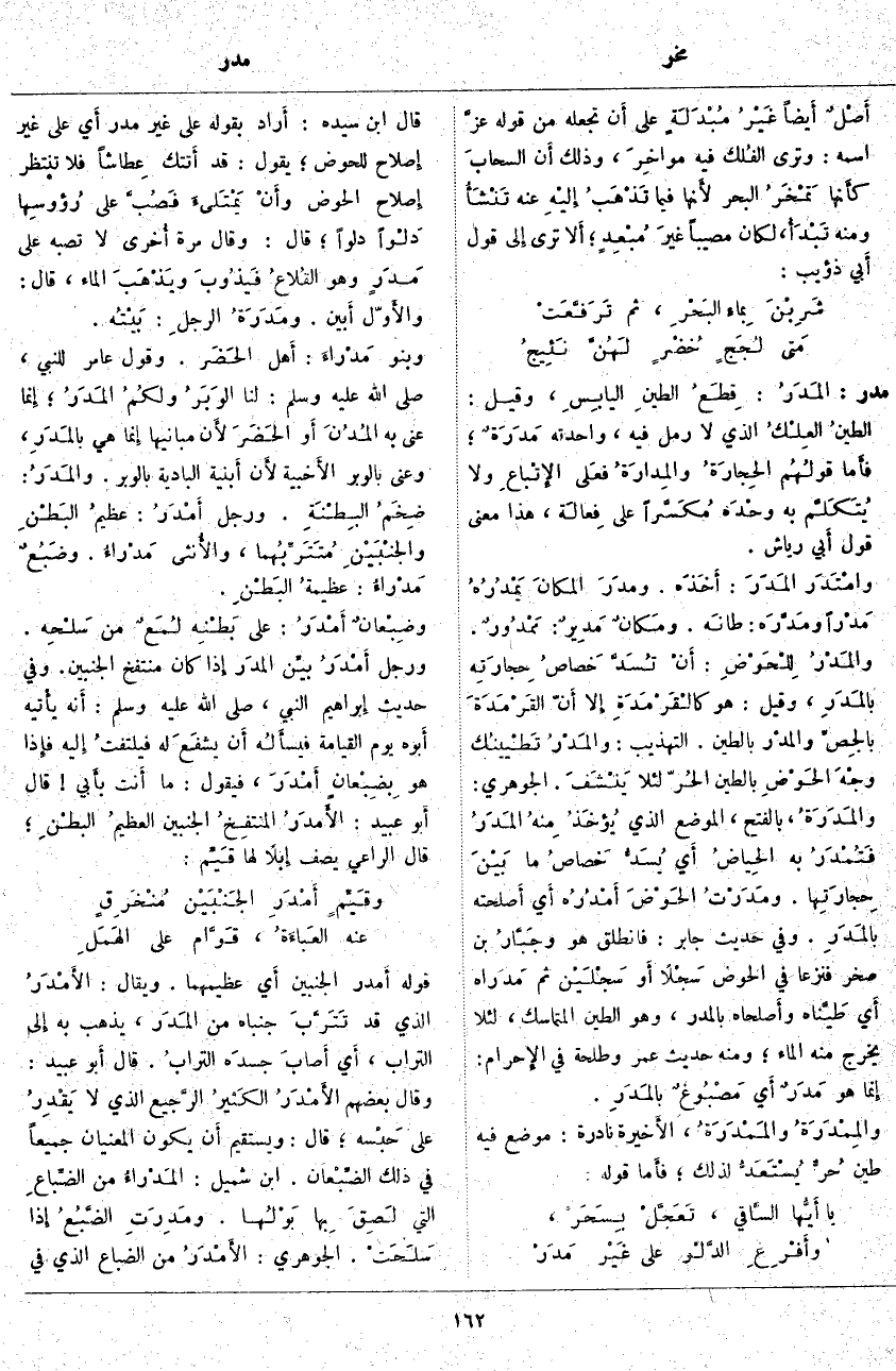 مدر: المَدَرُ: قِطَعُ الطينِ اليابِسِ، وَقِيلَ: الطينُ العِلْكُ الَّذِي لَا رَمْلَ فِيهِ، وَاحِدَتُهُ مَدَرَةٌ؛ فأَما قولُهُم الحِجارَةُ والمِدارَةُ فعَلى الإِتْباعِ وَلَا يُتَكَلَّم بِهِ وحدَه مُكَسَّراً عَلَى فِعالَة، هَذَا مَعْنَى قَوْلِ أَبي رِيَاشٍ. وامْتَدَر المَدَرَ: أَخَذَه. ومدَرَ المكانَ يَمْدُرُهُ مَدْراً ومَدَّرَه: طانَه. ومَكانٌ مَدِيرٌ: مَمْدُورٌ. والمَدْرُ لِلْحَوْضِ: أَنْ تُسَدَّ خصاصُ حِجارَتِه بالمَدَرِ، وَقِيلَ: هُوَ كالْقَرْمَدَةِ إِلا أَنّ القَرْمَدَةَ بالجِصِّ والمدْر بِالطِّينِ. التَّهْذِيبِ: والمَدْرُ تَطْيينُك وجْهَ الحَوْضِ بِالطِّينِ الحُرّ لِئَلَّا يَنْشَفَ. الْجَوْهَرِيُّ: والمَدَرَةُ، بِالْفَتْحِ، الْمَوْضِعُ الَّذِي يُؤخَذُ مِنهُ المَدَرُ فَتُمْدَرُ بِهِ الحِياضُ أَي يُسَدُّ خَصاصُ مَا بَيْنَ حِجارَتِها. ومَدَرْتُ الحَوْضَ أَمْدُرُه أَي أَصلحته بالمَدَرِ. وَفِي حَدِيثِ