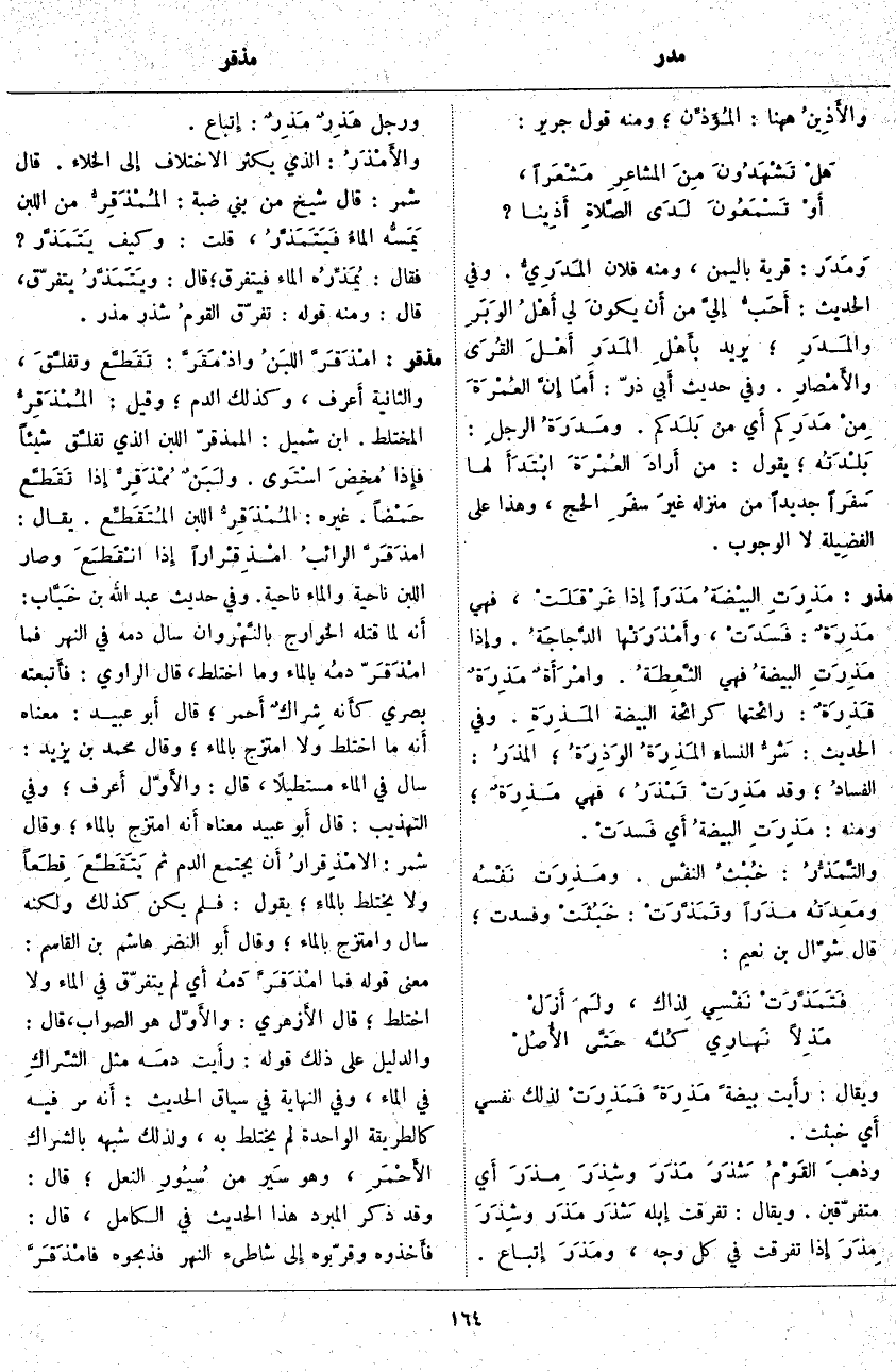 مذقر: امْذَقَرَّ اللبَنُ واذْمَقَرَّ: تَقَطَّع وتفلَّقَ، وَالثَّانِيَةُ أَعرف، وَكَذَلِكَ الدَّمُ؛ وَقِيلَ: المُمْذَقِرُّ الْمُخْتَلِطُ. ابْنُ شُمَيْلٍ: الْمُمْذَقِرُّ اللَّبَنُ الَّذِي تفلَّق شَيْئًا فإِذا مُخِضَ اسْتَوى. ولَبَنٌ مُمْذَقِرٌّ إِذا تَقَطَّع حَمْضاً. غَيْرُهُ: المُمْذَقِرُّ اللَّبَنُ المُتَقَطِّع. يُقَالُ: امذقَرَّ الرائبُ امْذِقْراراً إِذا انْقَطَعَ وَصَارَ اللَّبَنُ نَاحِيَةً وَالْمَاءُ نَاحِيَةً. وَفِي حَدِيثِ