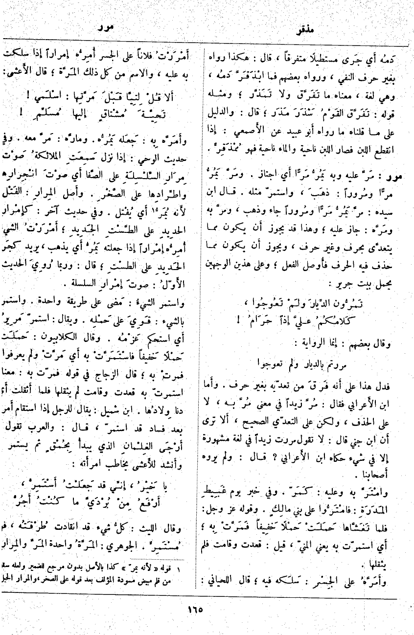 مرر: مَرَّ عَلَيْهِ وَبِهِ يَمُرُّ مَرًّا أَي اجْتَازَ. ومَرَّ يَمُرُّ مَرًّا ومُروراً: ذهَبَ، وَاسْتَمَرَّ مِثْلُهُ. قَالَ ابْنُ سِيدَهْ: مرَّ يَمُرُّ مَرًّا ومُروراً جَاءَ وَذَهَبَ، ومرَّ بِهِ ومَرَّه: جَازَ عَلَيْهِ؛ وَهَذَا قَدْ يَجُوزُ أَن يَكُونَ مِمَّا يتعدَّى بِحَرْفٍ وَغَيْرِ حَرْفٍ، وَيَجُوزُ أَن يَكُونَ مِمَّا حُذِفَ فِيهِ الْحَرْفُ فأُوصل الْفِعْلُ؛ وَعَلَى هَذَيْنِ الْوَجْهَيْنِ يُحْمَلُ بَيْتُ جَرِيرٍ: