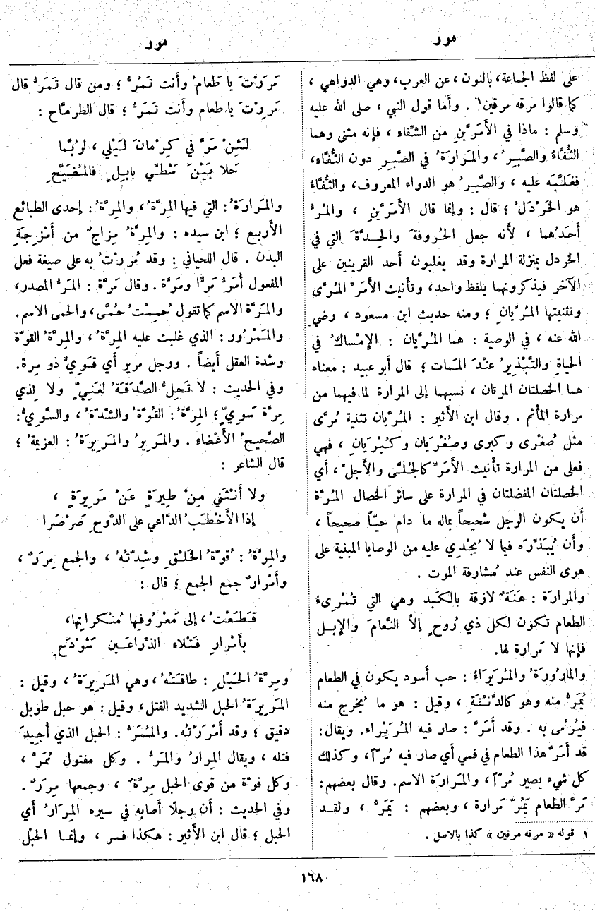 والمَرارَةُ: الَّتِي فِيهَا المِرَّةُ، والمِرَّة: إِحدى الطَّبَائِعِ الأَربع؛ ابْنُ سِيدَهْ: والمِرَّةُ مِزاجٌ مِنْ أَمْزِجَةِ الْبَدَنِ. قَالَ اللِّحْيَانِيُّ: وَقَدْ مُررْتُ بِهِ عَلَى صِيغَةِ فِعْلِ الْمَفْعُولِ أُمَرُّ مَرًّا ومَرَّة. وَقَالَ مَرَّة: المَرُّ الْمَصْدَرُ، والمَرَّة الِاسْمُ كَمَا تَقُولُ حُمِمْتُ حُمَّى، وَالْحُمَّى الِاسْمُ. والمَمْرُور: الَّذِي غَلَبَتْ عَلَيْهِ المِرَّةُ، والمِرَّةُ الْقُوَّةُ وَشِدَّةُ الْعَقْلِ أَيضاً. وَرَجُلٌ مَرِيرٌ أَي قَوِيُّ ذُو مِرّة. وَفِي الْحَدِيثِ: