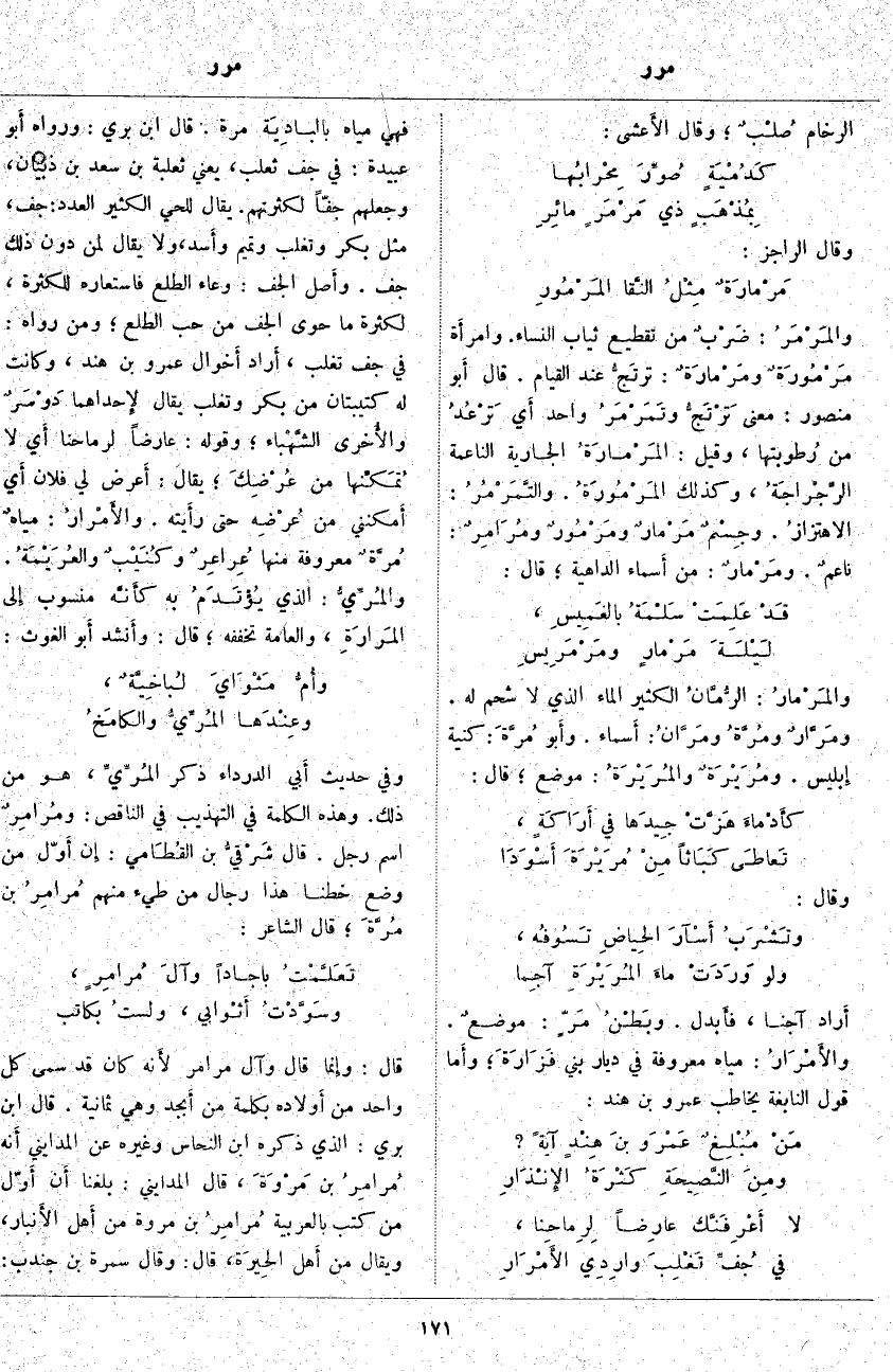 أَراد آجِنًا، فأَبدل. وبَطْنُ مَرٍّ: موضعٌ. والأَمْرَارُ: مِيَاهٌ مَعْرُوفَةٌ فِي دِيَارِ بَنِي فَزَارَةَ؛ وأَما قَوْلُ النَّابِغَةِ يُخَاطِبُ عَمْرَو بْنُ هِنْدٍ: