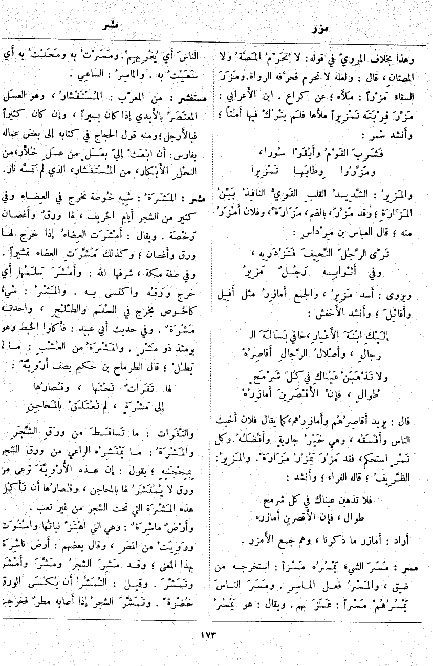 قَالَ: يُرِيدُ أَقاصِرُهُم وأَمازِرُهم، كَمَا يُقَالُ فُلَانٌ أَخبث النَّاسِ وأَفْسَقُه، وَهِيَ خَيْرُ جاريةٍ وأَفْضَلُهُ. وَكُلُّ تَمْرٍ اسْتَحْكَمَ، فَقَدْ مَزُرَ يَمْزُرُ مَزَارَةً. والمَزِيرُ: الظَّرِيفُ؛ قَالَهُ الْفَرَّاءُ؛ وأَنشد: