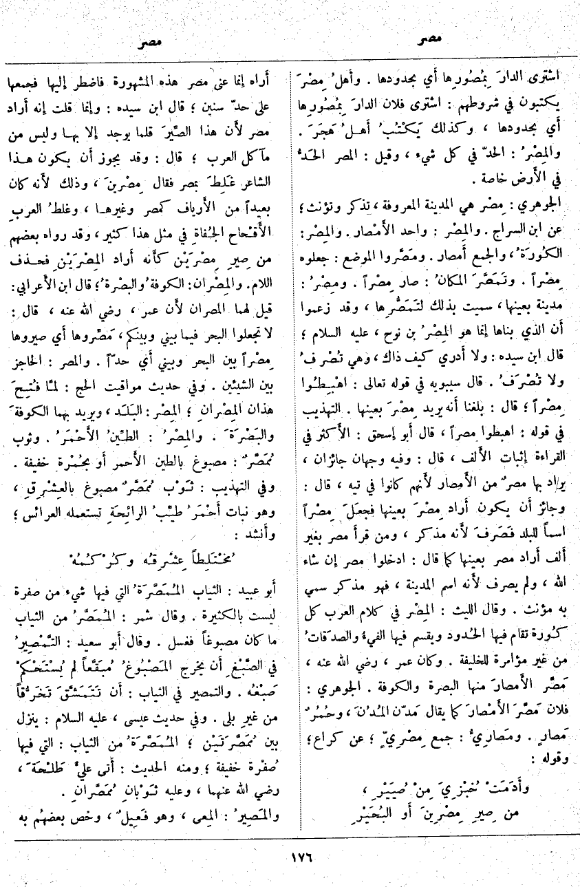 اشْتَرَى الدارَ بِمُصُورِها أَي بِحُدُودِهَا. وأَهلُ مِصْرَ يَكْتُبُونَ فِي شُرُوطِهِمْ: اشْتَرَى فُلَانٌ الدارَ بِمُصُورِها أَي بِحُدُودِهَا، وَكَذَلِكَ يَكْتُبُ أَهلُ هَجَرَ. والمِصْرُ: الْحَدُّ فِي كُلِّ شَيْءٍ، وَقِيلَ: الْمِصْرُ الحَدُّ فِي الأَرض خَاصَّةً. الْجَوْهَرِيُّ: مِصْر هِيَ الْمَدِينَةُ الْمَعْرُوفَةُ، تُذَكَّرُ وَتُؤَنَّثُ؛ عَنِ ابْنِ السَّرَّاجِ. والمِصْر: وَاحِدُ الأَمْصار. والمِصْر: الكُورَةُ، وَالْجَمْعُ أَمصار. ومَصَّروا الْمَوْضِعَ: جَعَلُوهُ مِصْراً. وتَمَصَّرَ المكانُ: صَارَ مِصْراً. ومِصْرُ: مَدِينَةٌ بِعَيْنِهَا، سُمِّيَتْ بِذَلِكَ لتَمَصُّرِها، وَقَدْ زَعَمُوا أَن الَّذِي بَنَاهَا إِنما هُوَ المِصْرُ بْنِ نُوحٍ، عَلَيْهِ السَّلَامُ؛ قَالَ ابْنُ سِيدَهْ: وَلَا أَدري كَيْفَ ذَاكَ، وَهِيَ تُصْرفُ وَلَا تُصْرَفُ. قَالَ سِيبَوَيْهِ فِي قَوْلِهِ تَعَالَى: اهْبِطُوا مِصْراً