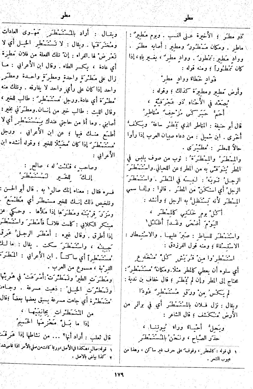 قَالَ أَبو حَنِيفَةَ: الْمُتَمَاطِرُ الَّذِي يَمْطُر سَاعَةً ويَكُفُّ أُخْرى. ابْنُ شُمَيْلٍ: مِنْ دُعَاءِ صِبْيَانِ الْعَرَبِ إِذا رأَوا حَالًا للمطَر: مُطَّيْرَى. والمِمْطَرُ والمِمْطَرَةُ: ثَوْبٌ مِنْ صُوفٍ يُلْبَسُ فِي الْمَطَرِ يُتَوَقَّى بِهِ مِنَ الْمَطَرِ؛ عَنِ اللِّحْيَانِي. واسْتَمْطَرَ الرجلُ ثَوبَهُ: لبِسَه فِي المَطَر. واسْتَمْطَرَ الرجلُ أَي استكَنّ مِنَ المطَر. قَالُوا: وإِنما سُمِّيَ المِمْطَر لأَنه يَسْتَظِلُّ بِهِ الرَّجُلُ؛ وأَنشد: