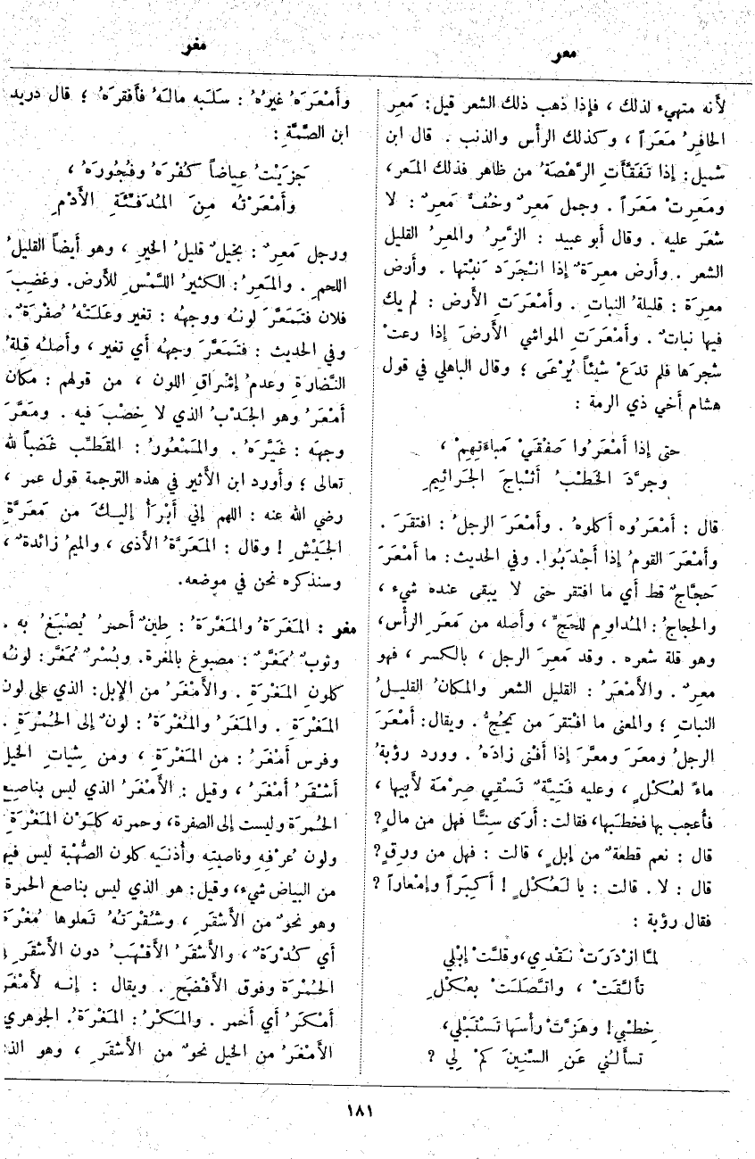 أَي مَا افْتَقَرَ حَتَّى لَا يَبْقَى عِنْدَهُ شَيْءٌ، والحجاجُ: المُداوِم للحَجِّ، وأَصله مِنْ مَعَرِ الرأْس، وَهُوَ قِلَّةُ شِعْرِهِ. وَقَدْ مَعِرَ الرَّجُلُ، بِالْكَسْرِ، فَهُوَ معِرٌ. والأَمْعَرُ: الْقَلِيلُ الشَّعْرِ والمكانُ القليلُ النباتِ؛ وَالْمَعْنَى مَا افْتقرَ مَنْ يَحُجُّ. وَيُقَالُ: أَمْعَرَ الرجلُ ومعَرَ ومعَّرَ إِذا أَفْنى زادَهُ. وَوَرَدَ رؤبةُ مَاءً لعُكْلٍ، وَعَلَيْهِ فَتِيَّةٌ تَسْقِي صِرْمَة لأَبيها، فأُعجب بِهَا فخطَبها، فَقَالَتْ: أَرَى سِنًّا فَهَلْ مِنْ مالٍ؟ قَالَ: نَعَمْ قطعةٌ مِنْ إِبلٍ، قَالَتْ: فَهَلْ مِنْ ورِقٍ؟ قَالَ: لَا. قَالَتْ: يَا لَعُكْلٍ أَكِبَراً وإِمْعاراً؟ فَقَالَ رُؤْبَةُ: