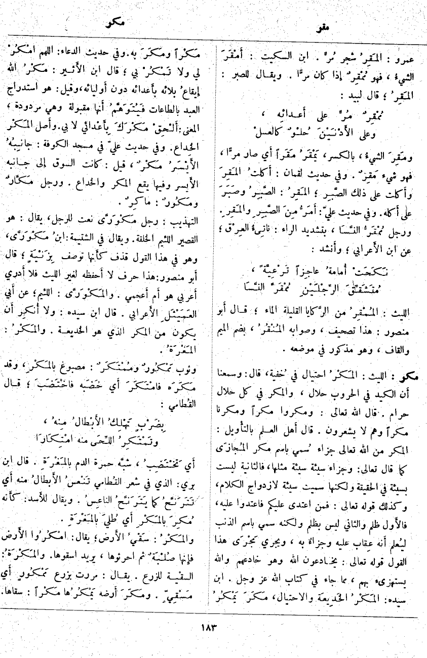 مكر: اللَّيْثُ: المَكْرُ احْتِيَالٌ فِي خُفية، قَالَ: وَسَمِعْنَا أَن الكيد في الحروف حَلَالٌ، وَالْمَكْرُ فِي كُلِّ حَلَالٍ حَرَامٌ. قَالَ اللَّهُ تَعَالَى: وَمَكَرُوا مَكْراً وَمَكَرْنا مَكْراً وَهُمْ لَا يَشْعُرُونَ