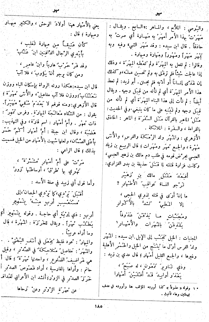 ؛ الْمَاهِرُ: الْحَاذِقُ بِالْقِرَاءَةِ، والسفَرة: الْمَلَائِكَةُ. الأَزهري: والمُهْر وَلَدُ الرَّمَكَة والفرسِ، والأُنثى مُهْرة، وَالْجَمْعُ مُهَر ومُهَرات؛ قَالَ الرَّبِيعُ بْنُ زِيَادٍ الْعَبْسِيُّ يحرِّض قَوْمَهُ فِي طَلَبِ دَمِ مَالِكِ بْنِ زُهَيْرٍ الْعَبْسِيِّ، وَكَانَتْ فَزَارَةُ قَتَلَتْهُ لَمَّا قَتَلَ حُذَيْفَةَ بْنِ بَدْرٍ الْفَزَارِيَّ:
