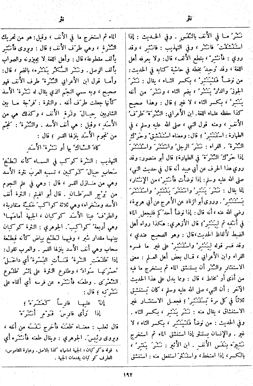 ؛ قَالَ الأَزهري: هَكَذَا رَوَاهُ أَهل الضَّبْطِ لأَلفاظ الْحَدِيثِ، قَالَ: وَهُوَ الصَّحِيحُ عِنْدِي، وَقَدْ فَسَّرَ قَوْلَهُ لِيَنْثِرْ واسْتَنْثِرْ عَلَى غَيْرِ مَا فَسَّرَهُ الْفَرَّاءُ وَابْنُ الأَعرابي، قَالَ بَعْضُ أَهل الْعِلْمِ: مَعْنَى الاستنثارِ والنَّثْر أَن يَسْتَنْشِقَ الْمَاءَ ثُمَّ يَسْتَخْرِجَ مَا فِيهِ مِنْ أَذى أَو مُخاط، قَالَ: وَمِمَّا يَدُلُّ عَلَى هَذَا الْحَدِيثُ الْآخَرُ: