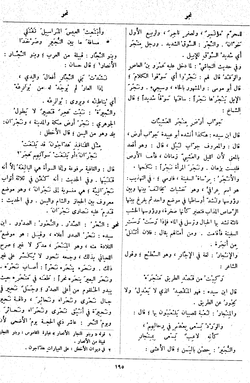 قَالَ ابْنُ سِيدَهْ: هَكَذَا أَنشده أَبو عُبَيْدَةَ جَوَّاب أَرض، قَالَ: وَالْمَعْرُوفُ جَوَّابُ لَيْل، قَالَ: وَهُوَ أَقعد بِالْمَعْنَى لأَن اللَّيْلَ والعَشِيّ زَمَانَانِ، فأَما الأَرض فَلَيْسَتْ بِزَمَانٍ. ونَجَرَ المرأَة نَجْراً: نكَحها. والأَنْجَرُ: مِرْساةُ السَّفِينَةِ، فَارِسِيٌّ؛ فِي التَّهْذِيبِ: هُوَ اسْمٌ عِراقيٌّ، وَهُوَ خَشبات يُخالَفُ بينها وبين رؤوسها وتُشدّ أَوساطها فِي مَوْضِعٍ وَاحِدٍ ثُمَّ يُفْرَغُ بَيْنَهَا الرَّصاص الْمُذَابُ فَتَصِيرُ كأَنها صخرة، ورؤوسها الخشب ناتئة بِهَا الْحِبَالُ وَتُرْسَلُ فِي الْمَاءِ فإِذا رَسَتْ رَسَتِ السَّفِينَةُ فأَقامت. وَمِنْ أَمثالهم يُقَالُ: فُلَانٌ أَثْقلُ مِن أَنجَرة. والإِنْجارُ: لُغَةٌ فِي الإِجَّارِ، وَهُوَ السَّطْح؛ وَقَوْلُ الشَّاعِرِ: