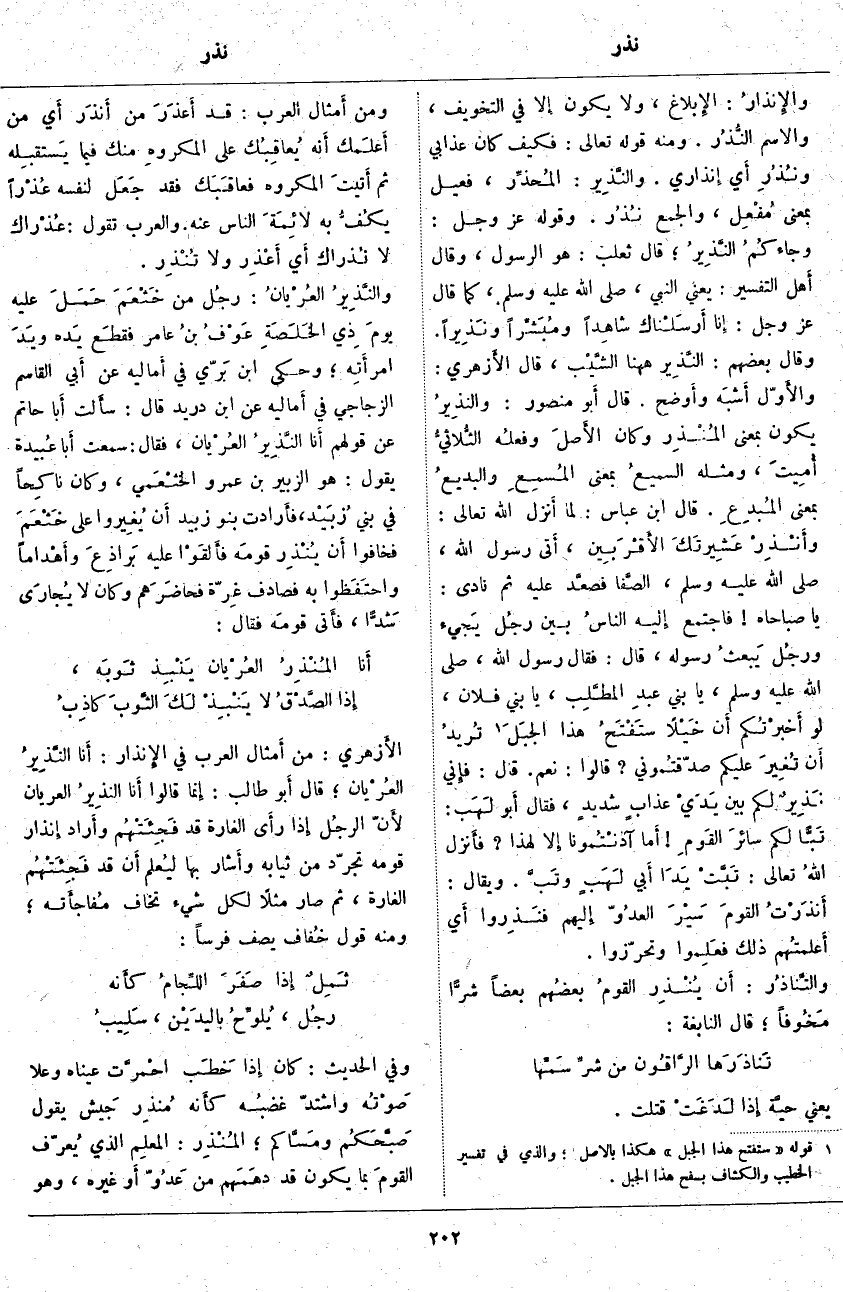 يَعْنِي حيَّة إِذا لَدَغَتْ قَتَلَتْ. وَمِنْ أَمثال الْعَرَبِ: قَدْ أَعذَرَ مَنْ أَنذَر أَي مَنْ أَعلَمك أَنه يُعاقِبُك عَلَى المكروهِ مِنْكَ فِيمَا يَستقبِله ثُمَّ أَتيتَ الْمَكْرُوهَ فعاقَبَك فَقَدْ جَعَل لِنَفْسِهِ عُذْراً يكُفُّ بِهِ لائِمَةَ النَّاسِ عَنْهُ. وَالْعَرَبُ تَقُولُ: عُذْراك لَا نُذراك أَي أَعْذِر وَلَا تُنْذِر. والنَّذِيرُ العُرْيانُ: رجُل مَنْ خَثْعَمَ حَمَلَ عَلَيْهِ يومَ ذِي الخَلَصَةِ عَوْفُ بنُ عَامِرٍ فقطَع يَده ويَدَ امرأَتِه؛ وَحَكَى ابْنُ بَرّي فِي أَماليه عَنْ أَبي الْقَاسِمِ الزَّجَّاجِيُّ فِي أَماليه عَنِ ابْنِ دُرَيْدٍ قَالَ: سأَلت أَبا حَاتِمٍ عَنْ قَوْلِهِمْ أَنا النَّذِيرُ العُرْيان، فَقَالَ: سَمِعْتُ أَبا عُبيدة يَقُولُ: هُوَ الزُّبَيْرُ بْنُ عَمْرٍو الخثْعَمي، وَكَانَ ناكِحاً فِي بَنِي زُبَيْد، فأَرادت بَنُو زُبَيْدٍ أَن يُغِيروا عَلَى خَثْعَمَ فَخَافُوا أَن يُنْذِر قومَه فأَلقَوْا عليه بَراذِعَ وأَهْداماً واحتَفَظوا بِهِ فَصَادَفَ غِرّة فحاضَرَهم وَكَانَ لَا يُجارَى شَدًّا، فأَتى قومَه فَقَالَ: