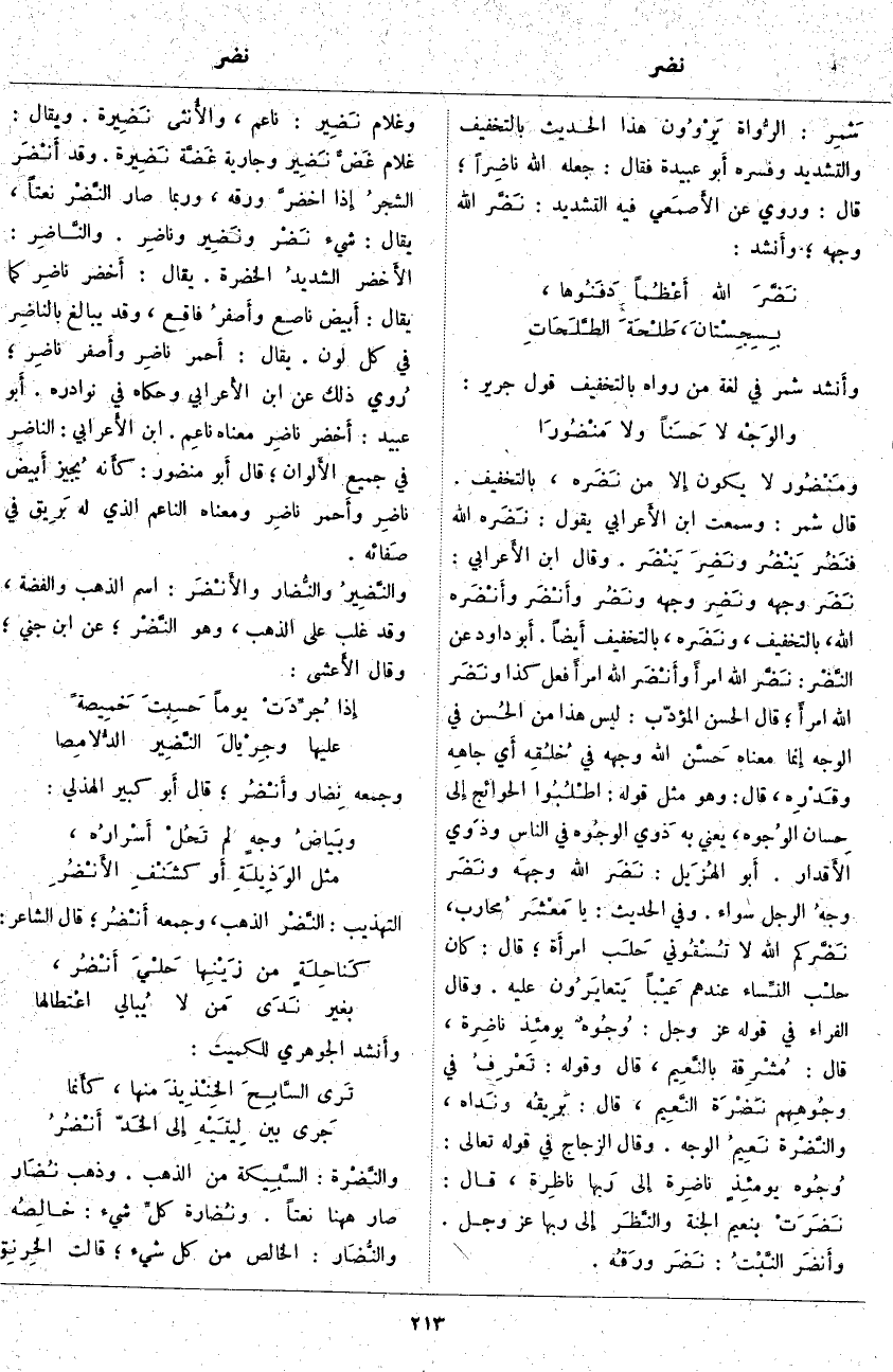 ، قَالَ: نَضَرَتْ بِنَعِيمِ الْجَنَّةِ والنَّظَر إِلى رَبِّهَا عَزَّ وَجَلَّ. وأَنضَر النَّبْتُ: نَضَر ورَقُه. وَغُلَامٌ نَضِير: نَاعِمٌ، والأُنثى نَضِيرة. وَيُقَالُ: غُلَامٌ غَضٌّ نَضِير وَجَارِيَةٌ غَضَّة نَضِيرة. وَقَدْ أَنْضَر الشجرُ إِذا اخضرَّ وَرَقُهُ، وَرُبَّمَا صَارَ النَّضْر نَعْتًا، يُقَالُ: شَيْءٌ نَضْر ونَضِير وناضِر. والنَّاضِر: الأَخضر الشديدُ الْخُضْرَةِ. يُقَالُ: أَخضر ناضِر كَمَا يُقَالُ: أَبيض ناصِع وأَصفرُ فاقِع، وَقَدْ يُبَالَغُ بالناضِر فِي كُلِّ لَوْنٍ. يُقَالُ: أَحمر ناضِر وأَصفر ناضِر، رُوي ذَلِكَ عَنِ ابْنِ الأَعرابي وَحَكَاهُ فِي نَوَادِرِهِ. أَبو عُبَيْدٍ: أَخضر ناضِر مَعْنَاهُ ناعِم. ابْنُ الأَعرابي: الناضِر فِي جَمِيعِ الأَلوان، قَالَ أَبو منضور: كأَنه يُجيز أَبيض ناضِر وأَحمر ناضِر وَمَعْنَاهُ النَّاعِمُ الَّذِي لَهُ بَرِيق فِي صَفَائِهِ. والنَّضِيرُ والنُّضار والأَنْضَر: اسْمُ الذَّهَبِ وَالْفِضَّةِ، وَقَدْ غَلَبَ عَلَى الذَّهَبِ، وَهُوَ النَّضْر، عَنِ ابْنِ جِنِّي، وَقَالَ الأَعشى: