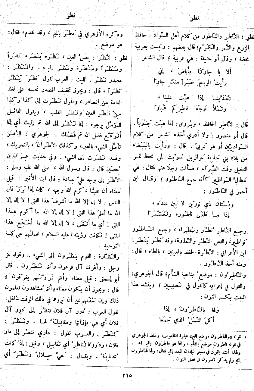 نطر: النَّاطِر والنَّاطور مِنْ كَلَامِ أَهل السَّواد: حَافِظُ الزَّرْعِ والتَّمر والكَرْم، قَالَ بَعْضُهُمْ: وَلَيْسَتْ بِعَرَبِيَّةٍ مَحْضَةٍ، وَقَالَ أَبو حَنِيفَةَ: هِيَ عَرَبِيَّةٌ؛ قَالَ الشَّاعِرُ: