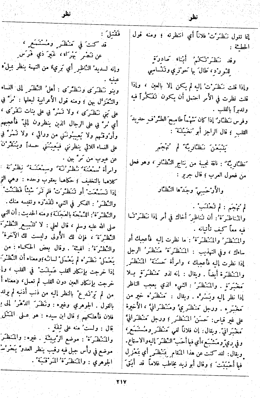 لَمْ تُهْجَم: لَمْ تُحْلَبْ. والمُناظَرَةُ: أَن تُناظِرَ أَخاك فِي أَمر إِذا نَظَرْتُما فِيهِ مَعًا كَيْفَ تأْتيانه. والمَنْظَرُ والمَنْظَرَةُ: مَا نَظَرْتَ إِليه فأَعجبك أَو سَاءَكَ، وَفِي التَّهْذِيبِ: المَنْظَرَةُ مَنْظَرُ الرَّجُلِ إِذا نَظَرْتَ إِليه فأَعجبك، وامرأَة حَسَنَةُ المَنْظَرِ والمَنْظَرة أَيضاً. وَيُقَالُ: إِنه لَذُو مَنْظَرَةٍ بِلَا مَخْبَرَةٍ. والمَنْظَرُ: الشَّيْءُ الَّذِي يُعْجِبُ النَّاظِرَ إِذا نَظَرَ إِليه ويَسُرُّه. وَيُقَالُ: مَنْظَرُه خَيْرٌ مِنْ مَخْبَرِه. وَرَجُلٌ مَنْظَرِيٌّ ومَنْظَرانيٌّ، الأَخيرة عَلَى غَيْرِ قِيَاسٍ: حَسَنُ المَنْظَرِ؛ وَرَجُلٌ مَنْظَرانيٌّ مَخْبَرانيّ. وَيُقَالُ: إِن فُلَانًا لَفِي مَنْظَرٍ ومُستَمَعٍ، وَفِي رِيٍّ ومَشْبَع، أَي فِيمَا أَحَبَّ النَّظَرَ إِليه وَالِاسْتِمَاعَ. وَيُقَالُ: لَقَدْ كُنْتُ عَنْ هَذَا المَقامِ بِمَنْظَرٍ أَي بمَعْزَل فِيمَا أَحْبَبْتَ؛ وَقَالَ أَبو زيد يُخَاطِبُ غُلَامًا قَدْ أَبَقَ فَقُتِلَ: