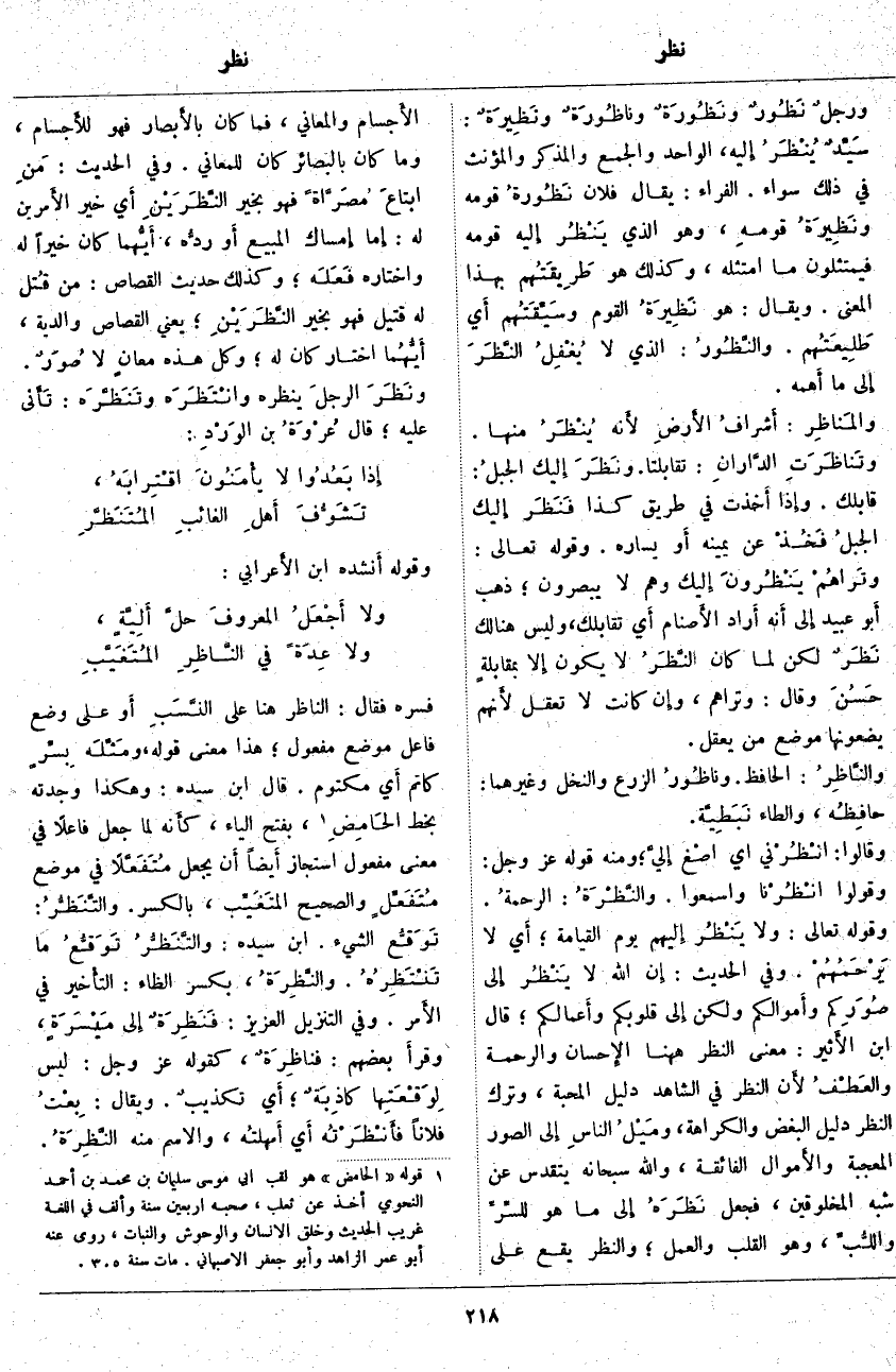 ورجلٌ نَظُورٌ ونَظُورَةٌ وناظُورَةٌ ونَظِيرَةٌ: سَيِّدٌ يُنْظَر إِليه، الْوَاحِدُ وَالْجَمْعُ وَالْمُذَكَّرُ وَالْمُؤَنَّثُ فِي ذَلِكَ سَوَاءٌ. الْفَرَّاءُ: يُقَالُ فُلَانٌ نَظُورةُ قَوْمِهِ ونَظِيرَةُ قومهِ، وَهُوَ الَّذِي يَنْظُرُ إِليه قَوْمُهُ فَيَمْتَثِلُونَ مَا امْتَثَلَهُ، وَكَذَلِكَ هُوَ طَرِيقَتُهم بِهَذَا الْمَعْنَى. وَيُقَالُ: هُوَ نَظِيرَةُ الْقَوْمِ وسَيِّقَتُهم أَي طَلِيعَتُهم. والنَّظُورُ: الَّذِي لَا يُغْفِلُ النَّظَرَ إِلى مَا أَهمه. والمَناظِر: أَشرافُ الأَرضِ لأَنه يُنْظَرُ مِنْهَا. وتَناظَرَتِ الدَّارانِ: تَقَابَلَتَا. ونَظَرَ إِليك الجبلُ: قَابَلَكَ. وإِذا أَخذت فِي طَرِيقِ كَذَا فَنَظَر إِليك الجبلُ فَخُذْ عَنْ يَمِينِهِ أَو يَسَارِهِ. وَقَوْلُهُ تَعَالَى: وَتَراهُمْ يَنْظُرُونَ إِلَيْكَ وَهُمْ لَا يُبْصِرُونَ