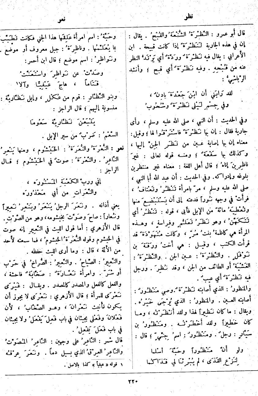 نعر: النُّعْرَةُ والنُّعَرَةُ: الخَيْشُوم، وَمِنْهَا يَنْعِرُ النَّاعِرُ. والنَّعْرَةُ: صوتٌ فِي الخَيْشُوم؛ قَالَ الرَّاجِزُ: