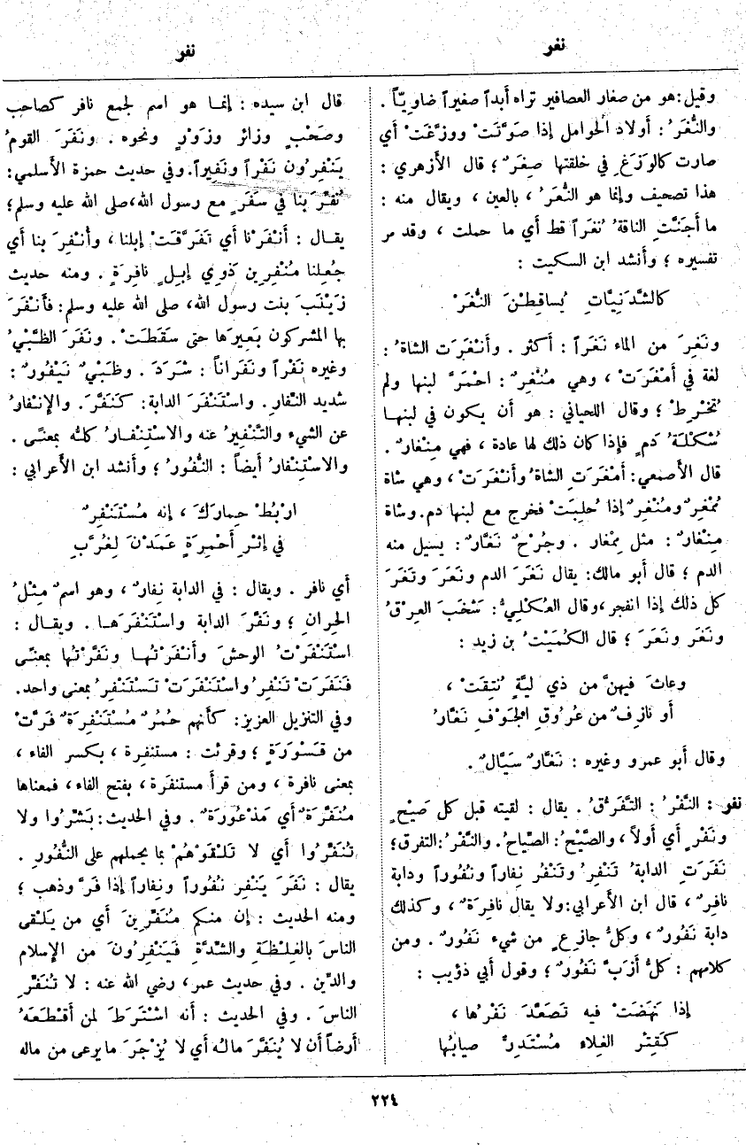 نفر: النَّفْرُ: التَّفَرُّقُ. يقال: لَقِيتُهُ قَبْلَ كُلِّ صَيْحٍ ونَفْرٍ أَي أَولًا، والصَّيْحُ: الصِّياحُ. والنَّفْرُ: التَّفَرُّقُ؛ نَفَرَتِ الدابةُ تَنْفِرُ وتَنْفُر نِفاراً ونُفُوراً وَدَابَّةٌ نافِرٌ، قَالَ ابْنُ الأَعرابي: وَلَا يُقَالُ نافِرَةٌ، وَكَذَلِكَ دَابَّةٌ نَفُورٌ، وكلُّ جازِعٍ مِنْ شَيْءٍ نَفُورٌ. وَمِنْ كَلَامِهِمْ: كلُّ أَزَبَّ نَفُورٌ؛ وَقَوْلُ أَبي ذُؤَيْبٍ: