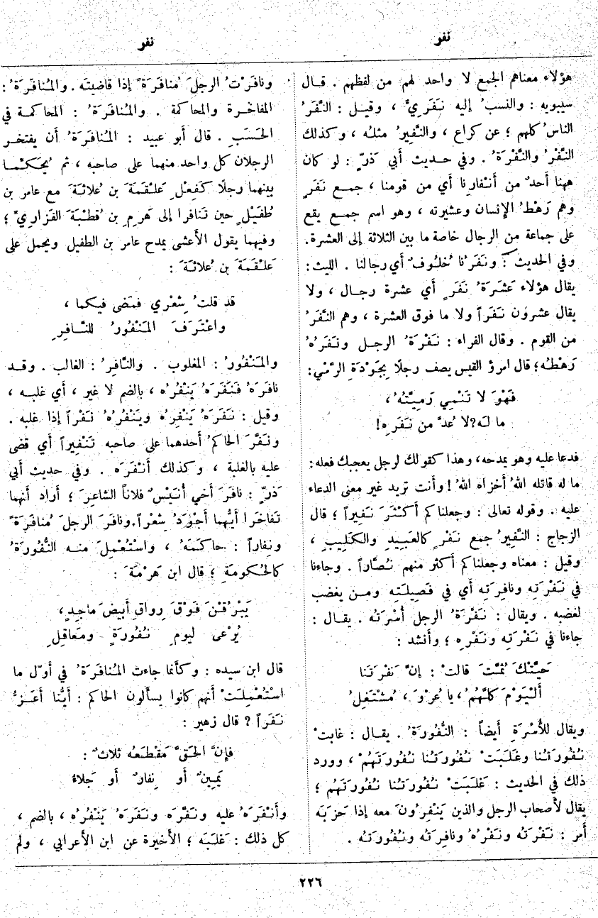 ؛ يُقَالُ لأَصحاب الرَّجُلِ وَالَّذِينَ يَنْفِرُونَ مَعَهُ إِذا حَزَبَه أَمر. نَفْرَتُه ونَفْرُهُ ونافِرَتُه ونُفُورَتُه. ونافَرْتُ الرجلَ مُنافَرَةً إِذا قاضيتَه. والمُنافَرَةُ: الْمُفَاخَرَةُ وَالْمُحَاكَمَةُ. والمُنافَرَةُ: الْمُحَاكَمَةُ فِي الحَسَبِ. قَالَ أَبو عُبَيْدٍ: المُنافَرَةُ أَن يَفْتَخِرَ الرَّجُلَانِ كُلَّ وَاحِدٍ مِنْهُمَا عَلَى صَاحِبِهِ، ثُمَّ يُحَكِّما بَيْنَهُمَا رَجُلًا كَفِعْلِ عَلْقَمَةَ بْنِ عُلاثَةَ مَعَ عَامِرِ بْنِ طُفَيْلٍ حِينَ تَنافرا إِلى هَرِمِ بْنِ قُطْبَةَ الفَزارِيِّ؛ وَفِيهِمَا يَقُولُ الأَعشى يَمْدَحُ عَامِرَ بْنَ الطُّفَيْلِ وَيَحْمِلُ عَلَى عَلْقَمَةَ بْنِ عُلاثَةَ: