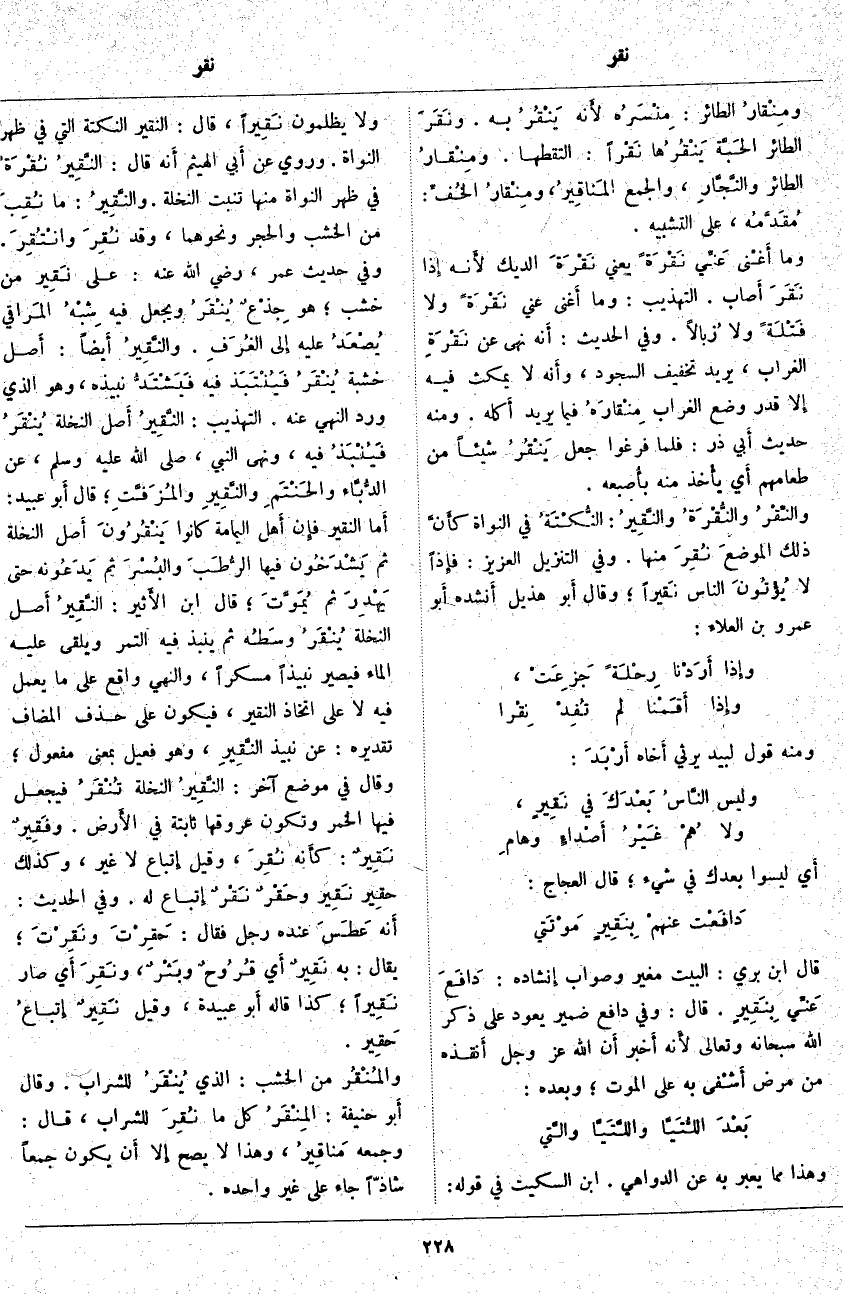 ؛ قَالَ أَبو عُبَيْدٍ: أَما النَّقِيرُ فإِن أَهل الْيَمَامَةِ كَانُوا يَنْقُرُونَ أَصل النَّخْلَةِ ثُمَّ يَشْدَخُون فِيهَا الرُّطَبَ والبُسْرَ ثُمَّ يَدَعُونه حَتَّى يَهْدِرَ ثُمَّ يُمَوَّتَ؛ قَالَ ابْنُ الأَثير: النَّقِيرُ أَصل النَّخْلَةِ يُنْقَرُ وسَطُه ثُمَّ يُنْبَذُ فِيهِ التَّمْرُ وَيُلْقَى عَلَيْهِ الْمَاءُ فَيَصِيرَ نَبِيذًا مُسْكِرًا، وَالنَّهْيُ وَاقِعٌ عَلَى مَا يُعْمَلُ فِيهِ لَا عَلَى اتِّخَاذِ النَّقِيرِ، فَيَكُونَ عَلَى حَذْفِ الْمُضَافِ تَقْدِيرُهُ: عَنْ نَبِيذِ النَّقِيرِ، وَهُوَ فَعِيلٌ بِمَعْنَى مَفْعُولٍ؛ وَقَالَ فِي مَوْضِعٍ آخَرَ: النَّقِيرُ النَّخْلَةُ تُنْقَرُ فَيُجْعَلُ فِيهَا الْخَمْرُ وَتَكُونُ عُرُوقُهَا ثَابِتَةً فِي الأَرض. وفَقِيرٌ نَقِيرٌ: كأَنه نُقِرَ، وَقِيلَ إِتباع لَا غَيْرَ، وَكَذَلِكَ حقِير نَقِير وحَقْرٌ نَقْرٌ إِتباع لَهْ. وَفِي الْحَدِيثِ: