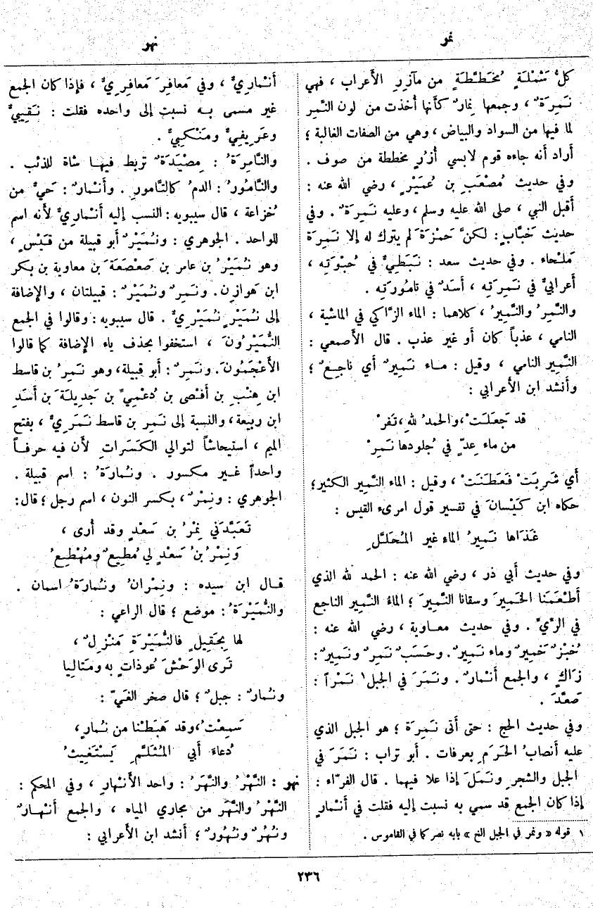نهر: النَّهْرُ والنَّهَرُ: وَاحِدُ الأَنْهارِ، وَفِي الْمُحْكَمِ: النَّهْرُ والنَّهَر مِنْ مَجَارِي الْمِيَاهِ، وَالْجَمْعُ أَنْهارٌ ونُهُرٌ ونُهُورٌ؛ أَنشد ابن الأَعرابي: