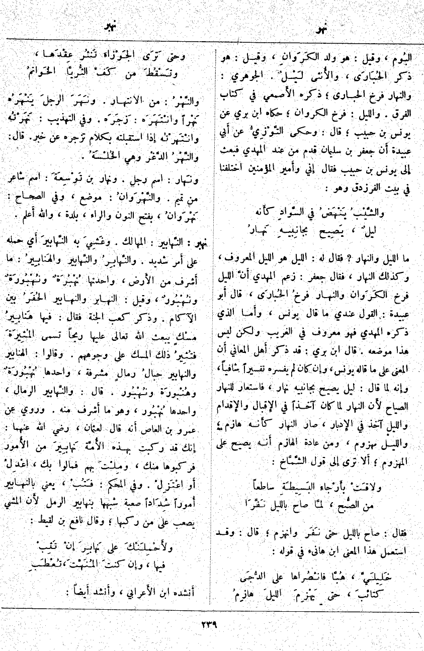 مَا اللَّيْلُ وَالنَّهَارُ؟ فَقَالَ لَهُ: اللَّيْلُ هُوَ اللَّيْلُ الْمَعْرُوفُ، وَكَذَلِكَ النَّهَارُ، فَقَالَ جَعْفَرٌ: زَعَمَ الْمَهْدِيُّ أَنَّ اللَّيْلَ فَرْخُ الكَرَوان وَالنَّهَارُ فرخُ الحُبارَى، قَالَ أَبو عُبَيْدَةَ: الْقَوْلُ عِنْدِي مَا قَالَ يُونُسُ، وأَما الَّذِي ذَكَرَهُ الْمَهْدِيُّ فَهُوَ مَعْرُوفٌ فِي الْغَرِيبِ وَلَكِنْ لَيْسَ هَذَا مَوْضِعِهِ. قَالَ ابْنُ بَرِّيٍّ: قَدْ ذَكَرَ أَهل الْمَعَانِي أَن الْمَعْنَى عَلَى مَا قَالَهُ يُونُسُ، وإِن كَانَ لَمْ يُفَسِّرْهُ تَفْسِيرًا شَافِيًا، وإِنه لَمَّا قَالَ: لَيْلٌ يَصِيحُ بِجَانِبَيْهِ نَهَارُ، فَاسْتَعَارَ لِلنَّهَارِ الصِّيَاحَ لأَن النَّهَارَ لَمَّا كَانَ آخِذًا فِي الإِقبال والإِقدام وَاللَّيْلَ آخَذُ فِي الإِدبار، صَارَ النَّهَارُ كأَنه هَازِمٌ، وَاللَّيْلُ مَهْزُومٌ، وَمِنْ عَادَةِ الْهَازِمِ أَنه يَصِيحُ عَلَى الْمَهْزُومِ؛ أَلا تَرَى إِلى قَوْلِ الشَّمَّاخ: