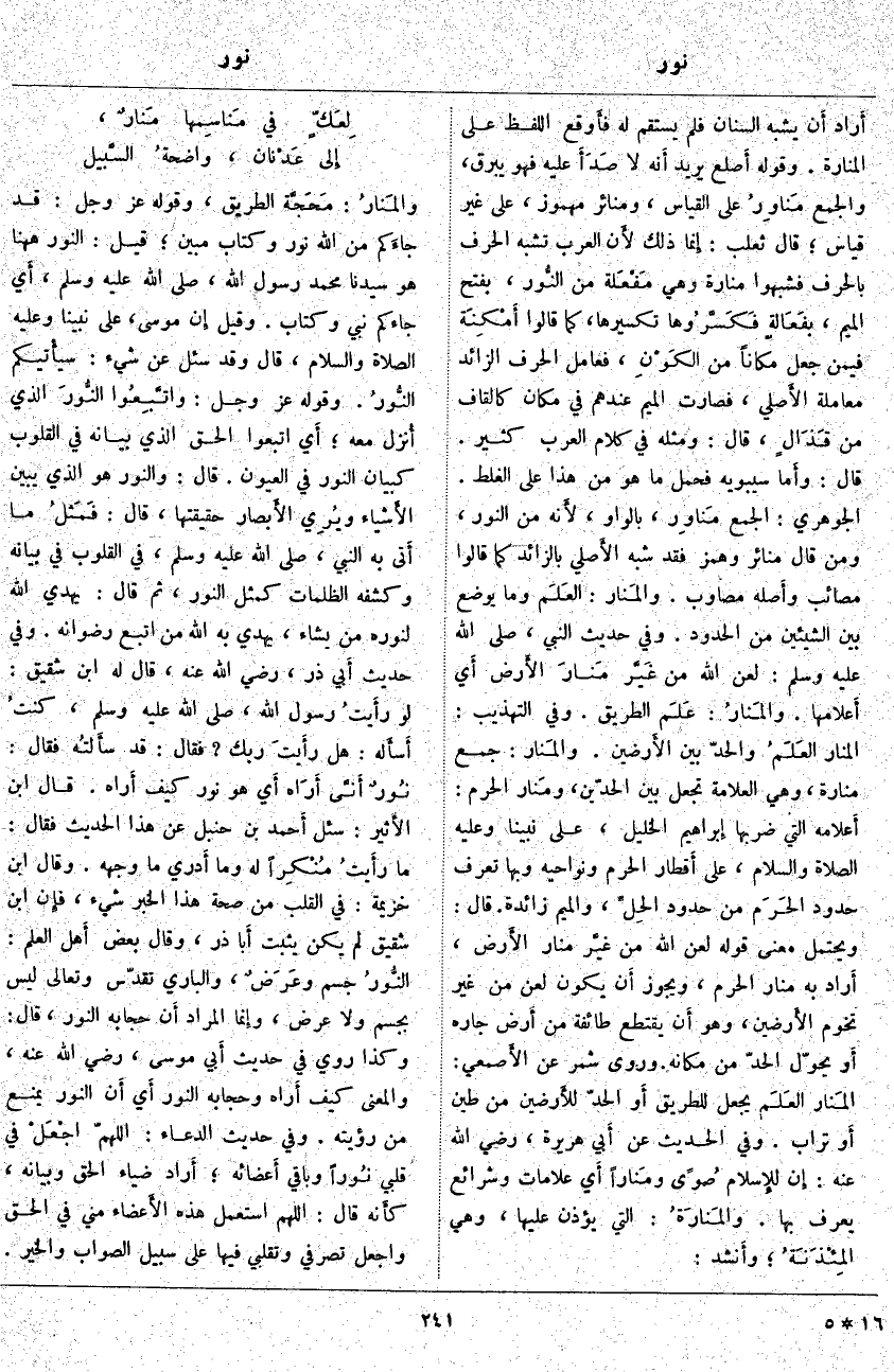 والمَنارُ: مَحَجَّة الطَّرِيقُ، وَقَوْلُهُ عَزَّ وَجَلَّ: قَدْ جاءَكُمْ مِنَ اللَّهِ نُورٌ وَكِتابٌ مُبِينٌ