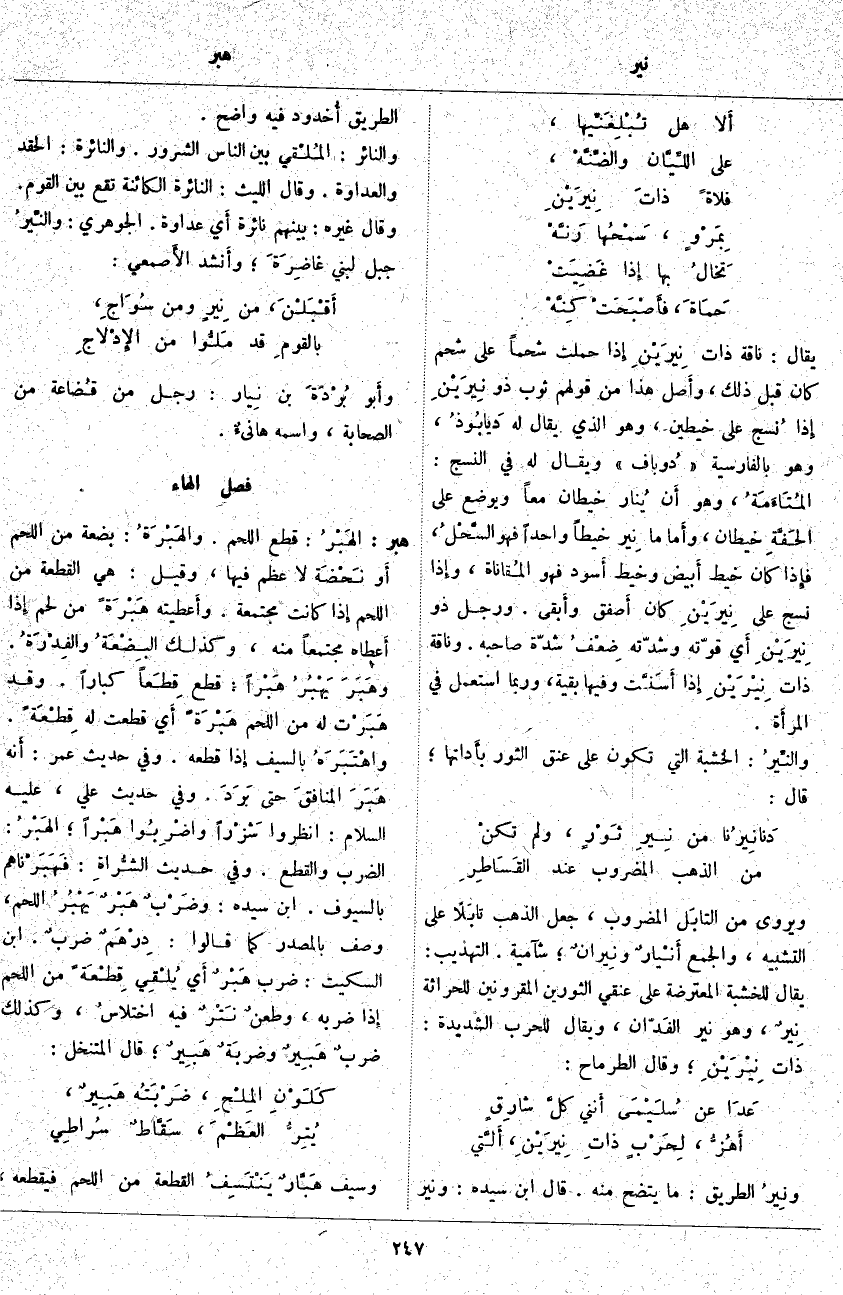 ونِيرُ الطَّرِيقِ: مَا يَتَّضِحُ مِنْهُ. قَالَ ابْنُ سِيدَهْ: وَنِيرُ الطَّرِيقِ أُخدود فِيهِ وَاضِحٌ. وَالنَّائِرُ: المُلْقي بَيْنَ النَّاسِ الشُّرُورَ. وَالنَّائِرَةُ: الْحِقْدُ وَالْعَدَاوَةُ. وَقَالَ اللَّيْثُ: النَّائِرَةُ الْكَائِنَةُ تَقَعُ بَيْنَ الْقَوْمِ. وَقَالَ غَيْرُهُ: بَيْنَهُمْ نَائِرَةٌ أَي عَدَاوَةٌ. الْجَوْهَرِيُّ: والنِّيرُ جَبَلٌ لِبَنِي غاضِرَةَ؛ وأَنشد الأَصمعي: