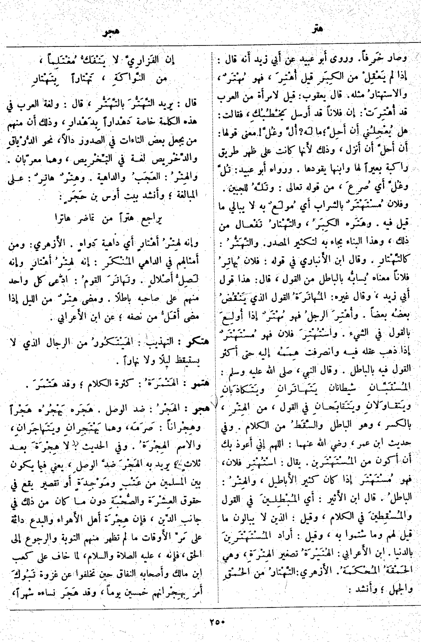 قَالَ: يُرِيدُ التَّهَتُّرَ بالتَّهَتُّرِ، قَالَ: وَلُغَةُ الْعَرَبِ فِي هَذِهِ الْكَلِمَةِ خَاصَّةً دَهْداراً بِدَهْدارِ، وَذَلِكَ أَن مِنْهُمْ مَنْ يَجْعَلُ بَعْضَ التَّاءَاتِ فِي الصُّدُورِ دَالًا، نَحْوَ الدُّرْياقِ والدِّخْرِيص لُغَةٌ فِي التِّخْرِيص، وَهُمَا مُعَرَّبَانِ. والهِتْرُ: العَجَبُ وَالدَّاهِيَةُ. وهِتْرٌ هاتِرٌ: عَلَى الْمُبَالَغَةِ؛ وأَنشد بَيْتُ أَوس بْنِ حَجَرٍ: