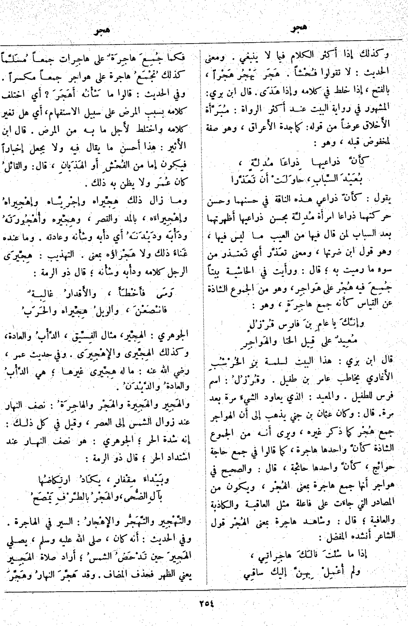 وَكَذَلِكَ إِذا أَكثر الْكَلَامَ فِيمَا لَا يَنْبَغِي. وَمَعْنَى الْحَدِيثِ: لَا تَقُولُوا فُحْشاً. هَجَر يَهْجُر هَجْراً، بِالْفَتْحِ، إِذا خَلَّطَ فِي كَلَامِهِ وإِذا هَذَى. قَالَ ابْنُ بَرِّيٍّ: الْمَشْهُورُ فِي رِوَايَةِ الْبَيْتِ عِنْدَ أَكثر الرُّوَاةِ: مُبَرَّأَة الأَخلاق عِوَضًا مِنْ قَوْلِهِ: كَمَاجِدَةِ الأَعراق، وَهُوَ صِفَةٌ لِمَخْفُوضٍ قَبْلَهُ، وَهُوَ: