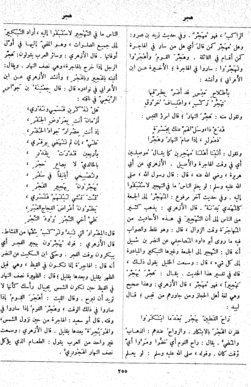 قَالَ الأَزهري: يَذْهَبُ كَثِيرٌ مِنَ النَّاسِ إِلى أَن التَّهْجِيرَ فِي هَذِهِ الأَحاديث مِنَ المُهاجَرَة وَقْتَ الزَّوَالِ، قَالَ: وَهُوَ غَلَطٌ وَالصَّوَابُ فِيهِ مَا رَوَى أَبو دَاوُدَ المَصاحِفي عَنِ النَّضْرِ بْنِ شُمَيْلٍ أَنه قَالَ: التَّهجير إِلى الْجُمُعَةِ وَغَيْرِهَا التَّبْكِيرُ وَالْمُبَادَرَةُ إِلى كُلِّ شَيْءٍ، قَالَ: وَسَمِعْتُ الْخَلِيلَ يَقُولُ ذَلِكَ، قَالَهُ فِي تَفْسِيرِ هَذَا الْحَدِيثِ. يُقَالُ: هَجَّرَ يُهَجِّرُ تَهْجِيراً، فَهُوَ مُهَجِّر، قَالَ الأَزهري: وَهَذَا صَحِيحٌ وَهِيَ لُغَةُ أَهل الْحِجَازِ وَمَنْ جَاوَرَهُمْ مِنْ قَيْسٍ؛ قَالَ لَبِيدٌ: