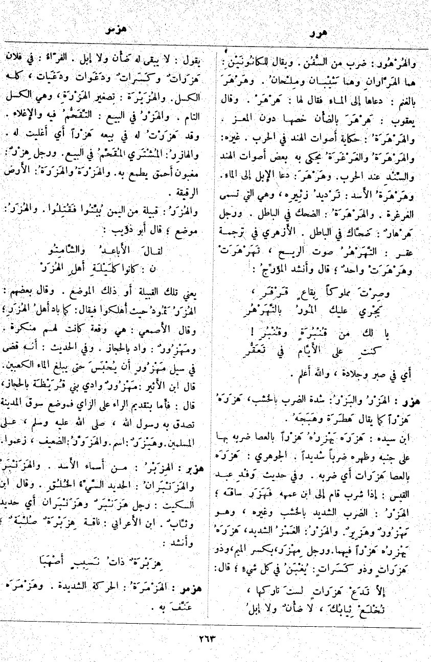 هزر: الهَزْرُ والبَزْرُ: شِدَّةُ الضَّرْبِ بِالْخَشَبِ، هَزَرَهُ هَزْراً كَمَا يُقَالُ هَطَرَهُ وهَبَجَهُ. ابْنُ سِيدَهْ: هَزَرَه يَهْزِرُهُ هَزْراً بِالْعَصَا ضَرَبَهُ بِهَا عَلَى جَنْبِهِ وَظَهْرِهِ ضَرْبًا شَدِيدًا. الْجَوْهَرِيُّ: هَزَرَه بِالْعَصَا هَزَرات أَي ضَرَبَهُ. وَفِي حَدِيثِ وَفْدِ عَبْدِ الْقَيْسِ: