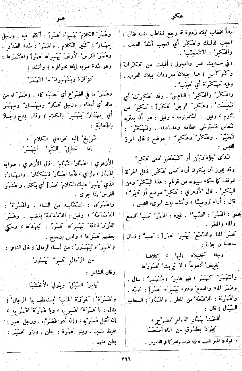 همر: الهَمْرُ: الصَّبُّ قوله [الهمر الصب] بابه ضرب ونصر كما في القاموس .. غَيْرُهُ: الهَمْرُ صَبُّ الدَّمْعِ وَالْمَاءِ وَالْمَطَرِ. هَمَرَ الماءُ والدَّمْعُ يَهْمِرُ هَمْراً: صَبَّ؛ قَالَ سَاعِدَةُ بْنُ جُؤَيَّةَ: