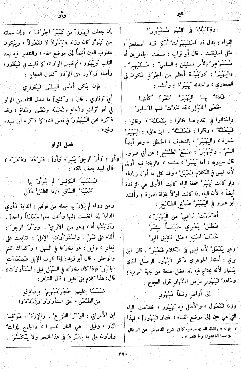 وَهُوَ يَفْعَلُّ لأَنه لَيْسَ فِي الْكَلَامِ فَعْيَلٌّ. قَالَ ابْنُ بَرِّيٍّ: أَسقط الْجَوْهَرِيُّ ذِكْرَ تَيْهُور لِلرَّمْلِ الَّذِي يَنْهار لأَنه يَحْتَاجُ فِيهِ إِلى فَضْلِ صَنْعَةٍ مِنْ جِهَةِ الْعَرَبِيَّةِ؛ وشاهدُ تَيْهورٍ لِلرَّمْلِ المُنْهارِ قَوْلُ الْعَجَّاجِ: إِلى أَراطٍ ونَقاً تَيْهُورِ وَزْنُهُ تَفْعُول، والأَصل فيه تَهْيُور، فقدِّمت الْيَاءِ الَّتِي هِيَ عَيْنُ إِلى مَوْضِعِ الْفَاءِ، فَصَارَ تَيْهُوراً، فَهَذَا إِن جعلت تَيهُوراً من تَيَهَّرَ الجُرُفُ، وإِن جَعَلْتَهُ مِنْ تَهَوَّر كَانَ وَزْنُهُ فَيْعُولًا لَا تَفْعُولًا، وَيَكُونُ مَقْلُوبَ الْعَيْنِ أَيضاً إِلى مَوْضِعِ الْفَاءِ، وَالتَّقْدِيرُ فِيهِ بَعْدَ الْقَلْبِ وَيْهُور، ثُمَّ قُلِبَتِ الْوَاوُ تَاءً كَمَا قُلِبَتْ فِي تَيْقُور، وأَصله وَيْقُور مِنَ الوَقار كَقَوْلِ الْعَجَّاجِ: