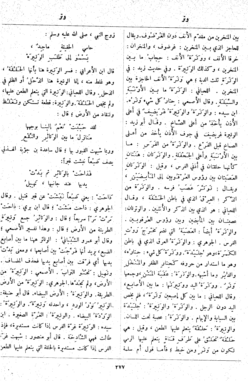 ؛ هِيَ وتَرَةُ الأَنف الْحَاجِزَةُ بَيْنَ الْمَنْخَرَيْنِ. اللِّحْيَانِيُّ: الوَتَرَةُ مَا بَيْنَ الأَرْنَبَةِ والسَّبَلَةِ. وَقَالَ الأَصمعي: خِتارُ كُلِّ شَيْءٍ وَتَرُه. ابْنُ سِيدَهْ: والوَتَرَةُ والوَتِيرَةُ غُرَيضيفٌ فِي أَعلى الأُذن يأْخُذُ مِنْ أَعلى الصِّماخ. وَقَالَ أَبو زَيْدٍ: الْوَتِيرَةُ غُرَيْضِيفٌ فِي جَوْفِ الأُذن يأْخذ مِنْ أَعلى الصِّمَاخِ قَبْلَ الفَرْع. والوَتَرَةُ مِنَ الفَرَسِ: مَا بَيْنَ الأَرْنَبَةِ وأَعلى الجَحْفَلةِ. والوَتَرَتان: هَنَتانِ كأَنهما حَلْقَتَانِ فِي أُذني الْفَرَسِ، وَقِيلَ: الوَتَرَتانِ العَصَبتان بين رؤوس العُرْقُوبين إِلى المَأْبِضَيْنِ، وَيُقَالُ: تَوَتَّرَ عَصَبُ فَرَسِهِ. والوَتَرَة مِنَ الذَّكر: العِرْقُ الَّذِي فِي بَاطِنِ الحَشَفَة، وَقَالَ اللِّحْيَانِيُّ: هُوَ الَّذِي بَيْنَ الذَّكَرِ والأُنثيين. وَالْوَتَرَتَانِ: عَصْبَتَانِ بين المأْبضين وبين رؤوس العُرقوبين. والوَتَرَةُ أَيضاً: العَصَبَةُ الَّتِي تَضُمُّ مَخْرَجَ رَوْثِ الْفَرَسِ. الْجَوْهَرِيُّ: والوَتَرَةُ الْعِرْقُ الَّذِي فِي بَاطِنِ الكَمَرَة، وَهُوَ جُلَيْدَةٌ. ووَتَرَةُ كُلِّ شَيْءٍ: حِتارُه، وَهُوَ مَا اسْتَدَارَ مِنَ حُرُوفِهِ كَحِتارِ الظُّفْرِ والمُنْخُلِ والدُّبُر وَمَا أَشبهه. والوَتَرَةُ: عَقَبَة المَتْنِ، وَجَمْعُهَا وَتَرٌ. ووَتَرَةُ الْيَدِ ووَتِيرَتُها: مَا بَيْنَ الأَصابع، وَقَالَ اللِّحْيَانِيُّ: مَا بَيْنَ كُلِّ إِصبعين وَتَرَةٌ، فَلَمْ يَخُصَّ الْيَدَ دُونَ الرِّجْلِ. والوَتَرَةُ والوَتِيرَةُ: جُلَيْدَة بَيْنَ السَّبَّابَةِ والإِبهام. والوَتَرَةُ: عَصَبَةٌ تَحْتَ اللِّسَانِ. والوتِيرَةُ: حَلْقَةٌ يُتَعَلَّمُ عَلَيْهَا الطَّعْنُ، وَقِيلَ: هِيَ حَلْقَةٌ تُحَلِّقُ عَلَى طَرَفِ قَناةٍ يُتَعَلَّمُ عَلَيْهَا الرَّمْيُ تَكُونُ مِنْ وَتَرٍ وَمِنْ خَيْطٍ؛ فأَما قَوْلُ أُم سَلَمَةَ زَوْجِ النَّبِيِّ، صَلَّى اللَّهُ عَلَيْهِ وَسَلَّمَ: