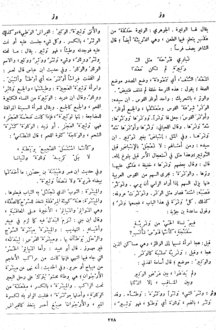 وثر: وثَرَ الشيءَ وثْراً ووَثَّرَهُ: وَطَّأَه. وَقَدْ وَثُر، بِالضَّمِّ، وثارَة أَي وَطُؤَ، فَهُوَ وَثِيرٌ، والأُنثى وَثِيرَةٌ. الوَثيرُ: الفِراشُ الوَطِيءُ، وَكَذَلِكَ الوِثْرُ، بِالْكَسْرِ. وَكُلُّ شَيْءٍ جَلَسْتَ عَلَيْهِ أَو نِمْتَ عَلَيْهِ فَوَجَدْتَهُ وَطِيئًا، فَهُوَ وَثِير. يُقَالُ: مَا تَحْتَهُ وِثْرٌ ووِثارٌ، وَشَيْءٌ وَثْرٌ ووَثِرٌ ووَثير، وَالِاسْمُ الوِثارُ والوَثارُ. وَفِي حَدِيثِ