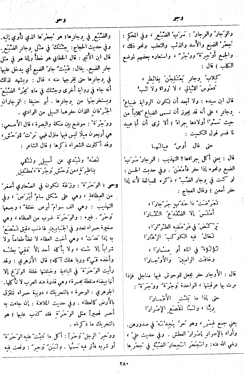 وحر: الوَحَرَةُ: وزَغَة تَكُونُ فِي الصَّحاري أَصغرُ مِنَ العِظاءَةِ، وَهِيَ عَلَى شَكْلِ سامِّ أَبْرَصَ، وَفِي التَّهْذِيبِ: وَهِيَ إِلْفُ سَوَامِّ أَبرص خِلْقَةً، وَجَمْعُهَا وَحَرٌ. غَيْرُهُ: والوَحَرَة ضَرْبٌ مِنَ العظاءِ، وَهِيَ صَغِيرَةٌ حَمْرَاءُ تَعْدُو فِي الجَبابِينِ لَهَا ذَنَبٌ دَقِيقٌ تَمْصَعُ بِهِ إِذا عَدَتْ، وَهِيَ أَخبث الْعِظَاءِ لَا تطأُ طَعَامًا وَلَا شَرَابًا إِلا شَمَّتْهُ، وَلَا يأْكله أَحد إِلَّا دَقِيَ بطنُه وأَخذه قَيْءٌ وَرُبَّمَا هَلَكَ آكِلُهُ؛ قَالَ الأَزهري: وَقَدْ رأَيت الوَحَرَةَ فِي الْبَادِيَةِ وخِلقتها خِلْقَةُ الوَزَغ إِلا أَنها بَيْضَاءُ مُنَقَّطَةٌ بِحُمْرَةٍ، وَهِيَ قَذِرَةٌ عِنْدَ الْعَرَبِ لَا تأْكلها. الْجَوْهَرِيُّ: الْوَحَرَةُ، بِالتَّحْرِيكِ، دُوَيْبَّةٌ حَمْرَاءُ تَلْتَزِقُ بالأَرض كَالْعِظَاءِ. وَفِي حَدِيثِ الْمُلَاعَنَةِ: