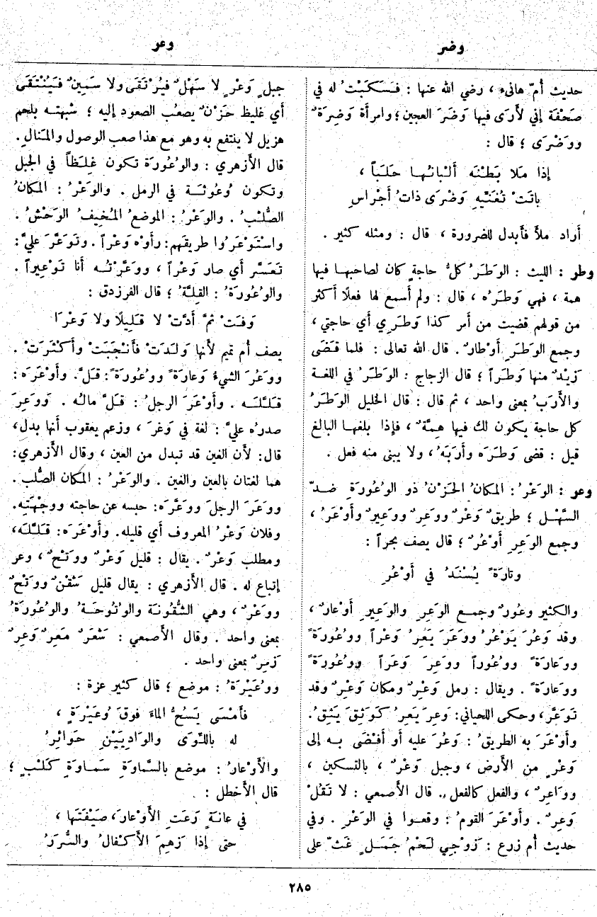 وعر: الوَعْرُ: المكانُ الحَزْنُ ذُو الوُعُورَةِ ضِدُّ السَّهْل؛ طريقٌ وَعْرٌ ووَعِرٌ ووَعِيرٌ وأَوْعَرُ، وَجَمْعُ الوَعِرِ أَوْعُرٌ؛ قَالَ يَصِفُ بَحْرًا: