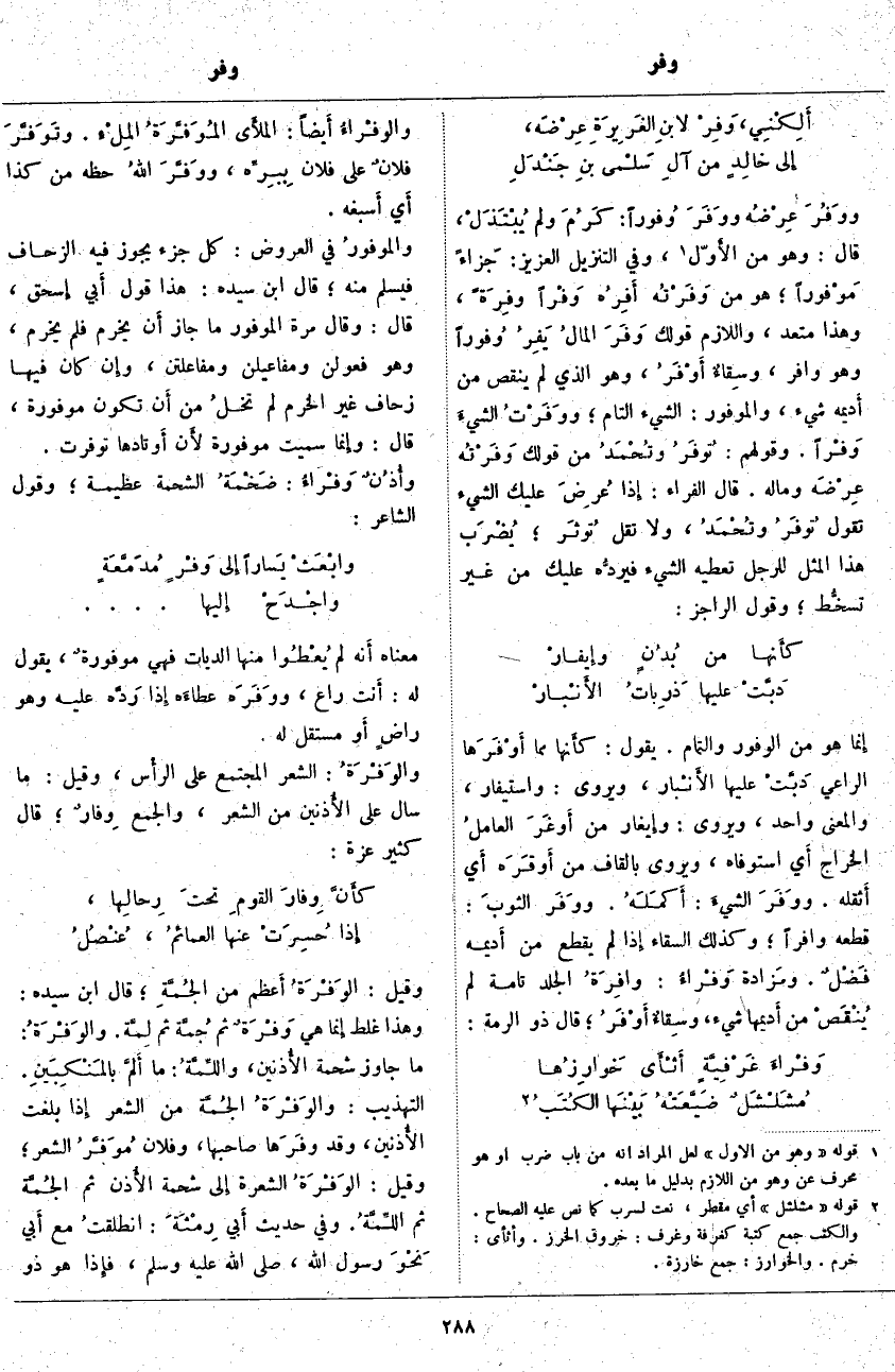 ووَفُرَ عِرْضُه ووَفَرَ وُفوراً: كَرُمَ وَلَمْ يُبْتَذَلْ، قَالَ: وَهُوَ مِنَ الأَوّل «3»، وَفِي التَّنْزِيلِ الْعَزِيزِ: جَزاءً مَوْفُوراً