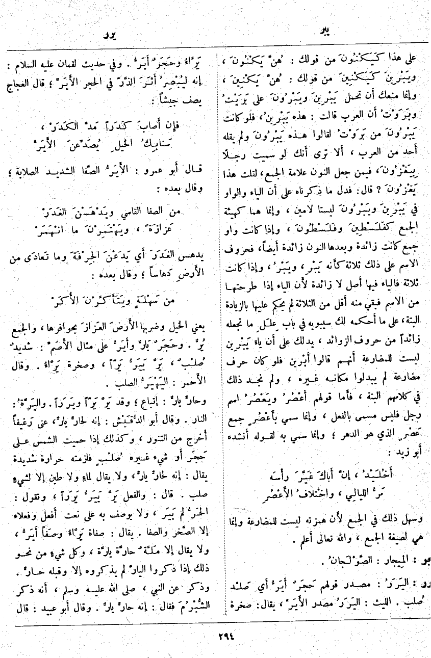 يَعْنِي الْخَيْلَ وَضَرْبِهَا الأَرضَ العَزازَ بِحَوَافِرِهَا، وَالْجَمْعِ يُرٌّ. وحَجَرٌ يَارٌّ وأَيَرُّ عَلَى مِثَالِ الأَصَمِّ: شديدٌ صُلْبٌ، يَرَّ يَيَرُّ يَرّاً، وَصَخْرَةٌ يَرَّاءُ. وَقَالَ الأَحمر: اليَهْيَرُّ الصُّلْبُ. وحارٌّ يارٌّ: إِتباع؛ وَقَدْ يَرَّ يَرّاً ويَرَراً. واليَرَّةُ: النَّارُ. وَقَالَ أَبو الدُّقَيْش: إِنه لحارٌّ يارٌّ، عَنَى رَغيفاً أُخرج مِنَ التَّنُّورِ، وَكَذَلِكَ إِذا حَمِيَتِ الشَّمْسُ عَلَى حَجَر أَو شَيْءٍ غَيْرِهِ صُلْبٍ فَلَزِمَتْهُ حَرَارَةٌ شَدِيدَةٌ يُقَالُ: إِنه لحارٌّ يارٌّ، وَلَا يُقَالُ لماءٍ وَلَا طِينٍ إِلا لشيءٍ صُلْبٍ. قَالَ: وَالْفِعْلُ يَرَّ يَيَرُّ يَرَراً، وَتَقُولُ: الحَرُّ لَمْ يَيَر، وَلَا يُوصَفُ بِهِ عَلَى نَعْتِ أَفعل وَفَعْلَاءِ إِلا الصَّخر وَالصَّفَا. يُقَالُ: صَفَاةٌ يَرَّاءُ وصَفاً أَيَرُّ، وَلَا يُقَالُ إِلا مَلَّةٌ حارَّة يارَّة، وَكُلُّ شيءٍ مِنْ نَحْوِ ذَلِكَ إِذا ذَكَرُوا اليارَّ لَمْ يَذْكُرُوهُ إِلا وَقَبْلَهُ حارٌّ. وَذَكَرَ عَنِ