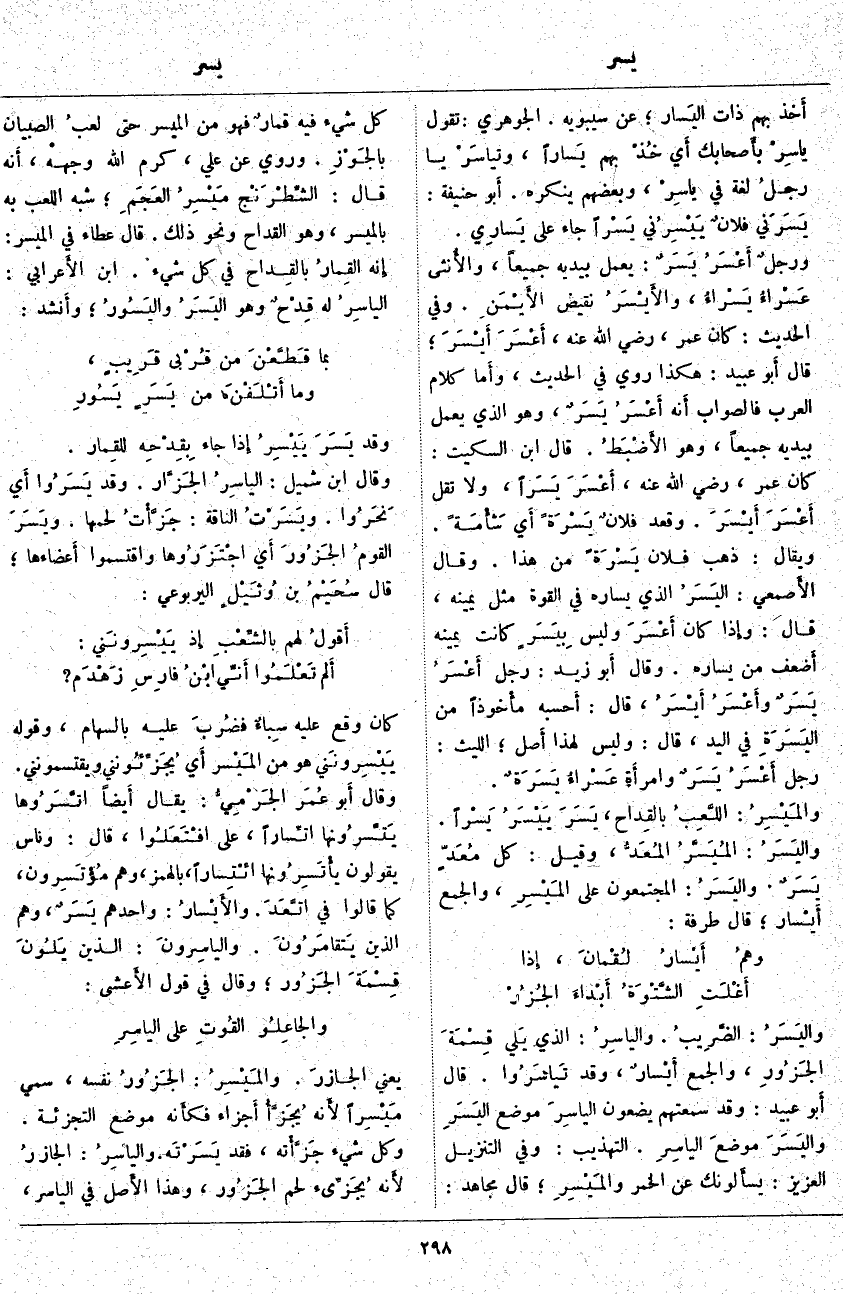 ؛ شَبَّهَ اللَّعِبَ بِهِ بِالْمَيْسِرِ، وَهُوَ الْقَدَاحُ وَنَحْوَ ذَلِكَ. قَالَ عَطَاءٌ فِي الْمَيْسِرِ: إِنه القِمارُ بالقِداح فِي كُلِّ شَيْءٍ. ابْنُ الأَعرابي: الياسِرُ لَهُ قِدْحٌ وَهُوَ اليَسَرُ واليَسُورُ؛ وأَنشد: