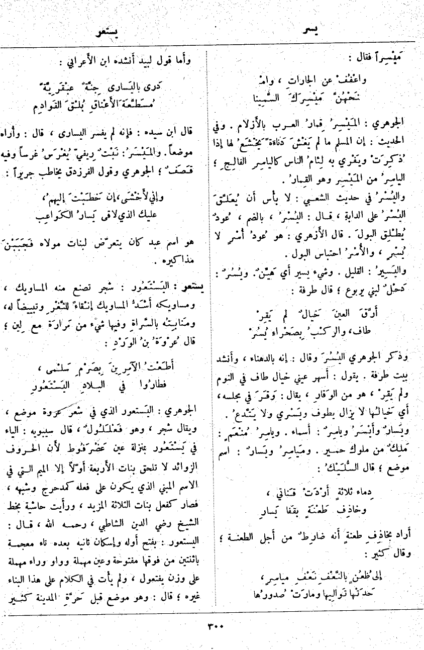 وَذَكَرَ الْجَوْهَرِيُّ اليُسُرَ وَقَالَ: إِنه بِالدَّهْنَاءِ، وأَنشد بَيْتَ طَرَفَةَ. يَقُولُ: أَسهر عَيْنَيْ خَيَالٌ طَافَ فِي النَّوْمِ وَلَمْ يَقِرْ، هُوَ مِنَ الوَقارِ، يُقَالُ: وَقَرَ فِي مَجْلِسِهِ، أَي خَيالُها لَا يَزَالُ يَطُوفُ ويَسْري وَلَا يَتَّدعُ. ويَسارٌ وأَيْسَرُ وياسِرٌ: أَسماء. وياسِرُ مُنْعَمٍ: مَلِكٌ مِنْ مُلُوكِ حِمْيَرٍ. ومَياسِرُ ويَسارٌ: اسْمُ مَوْضِعٍ؛ قَالَ السُّلَيْكُ: