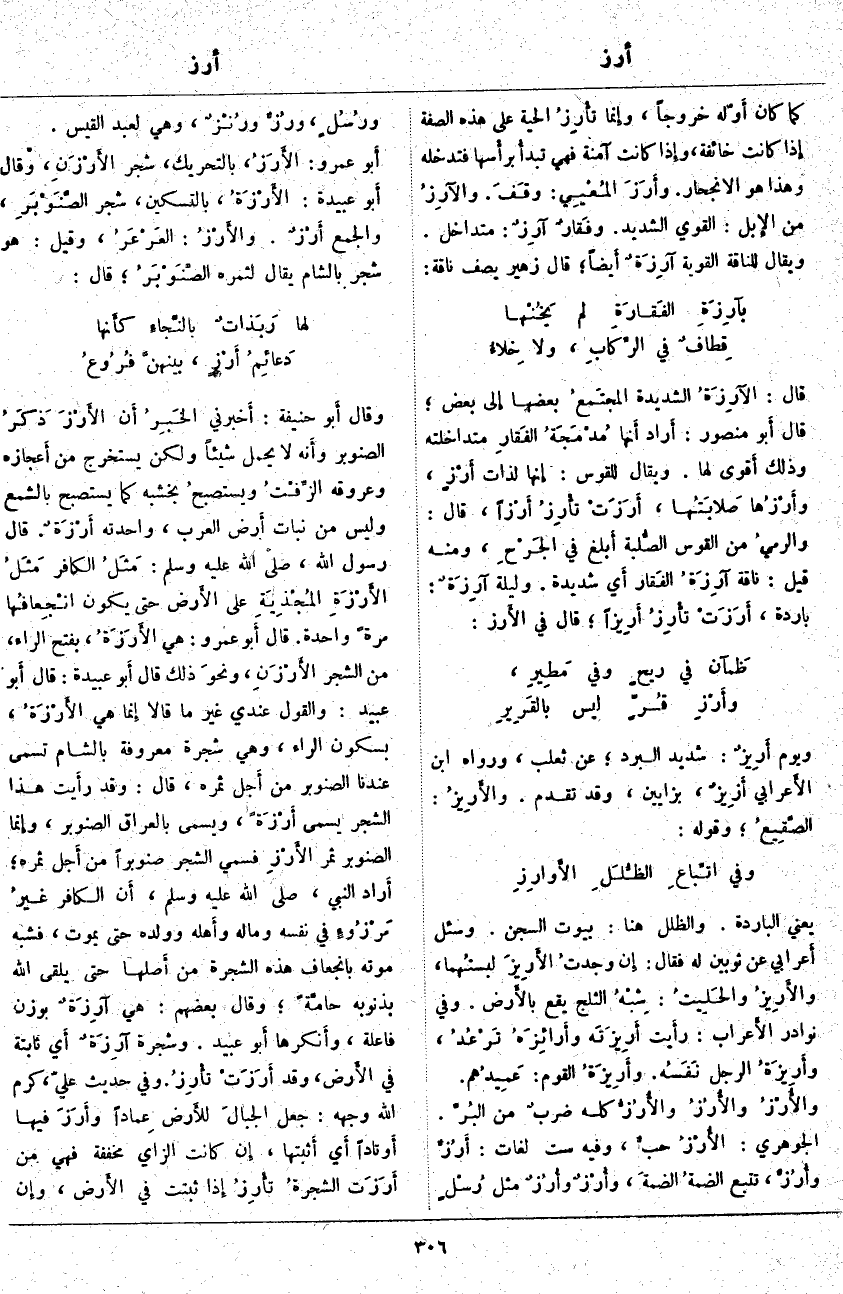 وَقَالَ أَبو حَنِيفَةَ: أَخبرني الخَبِرُ أَن الأَرْزَ ذَكَرُ الصَّنَوْبَرِ وأَنه لَا يَحْمِلُ شَيْئًا وَلَكِنْ يُسْتَخْرَجُ مِنْ أَعجازه وَعُرُوقِهِ الزِّفْتُ ويستصبحُ بِخَشَبِهِ كَمَا يَسْتَصْبَحُ بِالشَّمْعِ وَلَيْسَ مِنْ نَبَاتِ أَرض الْعَرَبِ، وَاحِدَتُهُ أَرْزَةٌ.